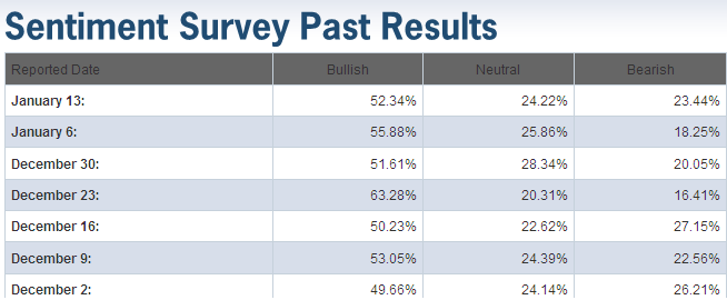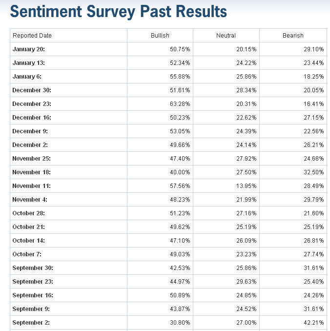 Entre as semanas 6 a 13 de Janeiro vêmos uma perda directa do sentimento "bullish" para "bearish". Como referído antes, este poderá ser o factor mais importante para alarme. O sentimento "bulish" tem-se perdido, não para os "moderados" (neutral), mas sim para os pessímistas ("bearish").