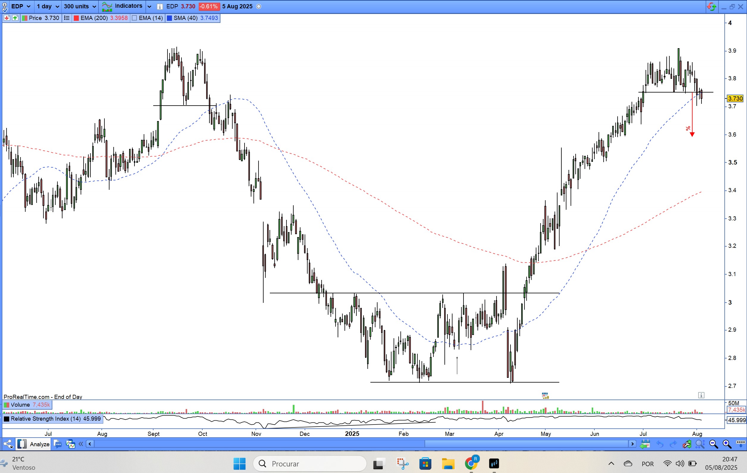 Na EDP ganha-se mais é a longo prazo por causa dos dividendos e reinvestimento dos mesmos. Mais valias na EDP é dificil com este comportamento. Já andamos nisto neste ultimos 2 anos e meio (curiosamente o bcp sobe quase sempre neste horizonte ou seja é o inverso da EDP).