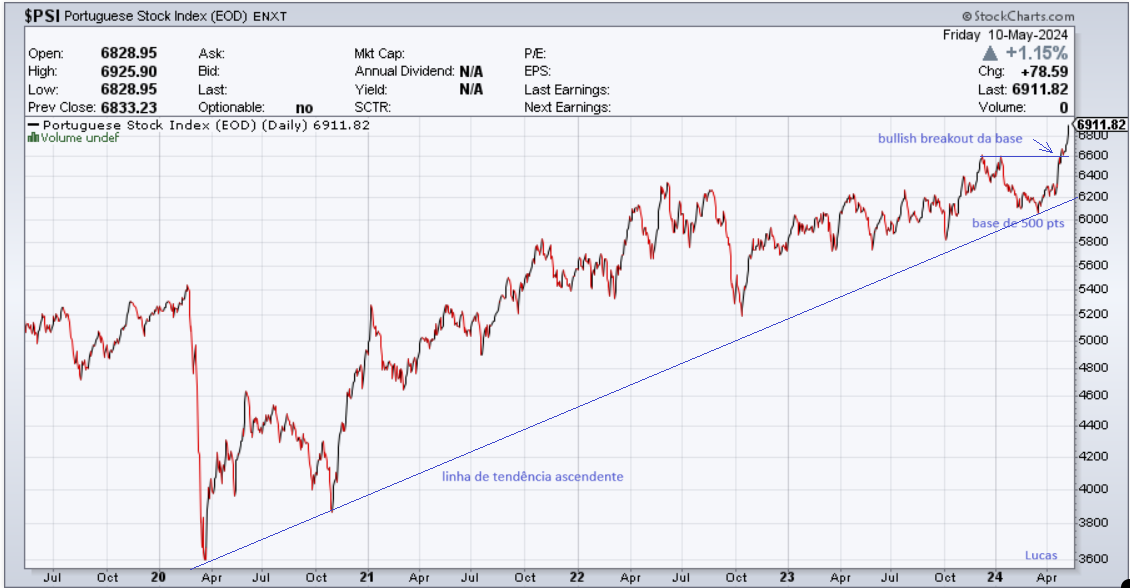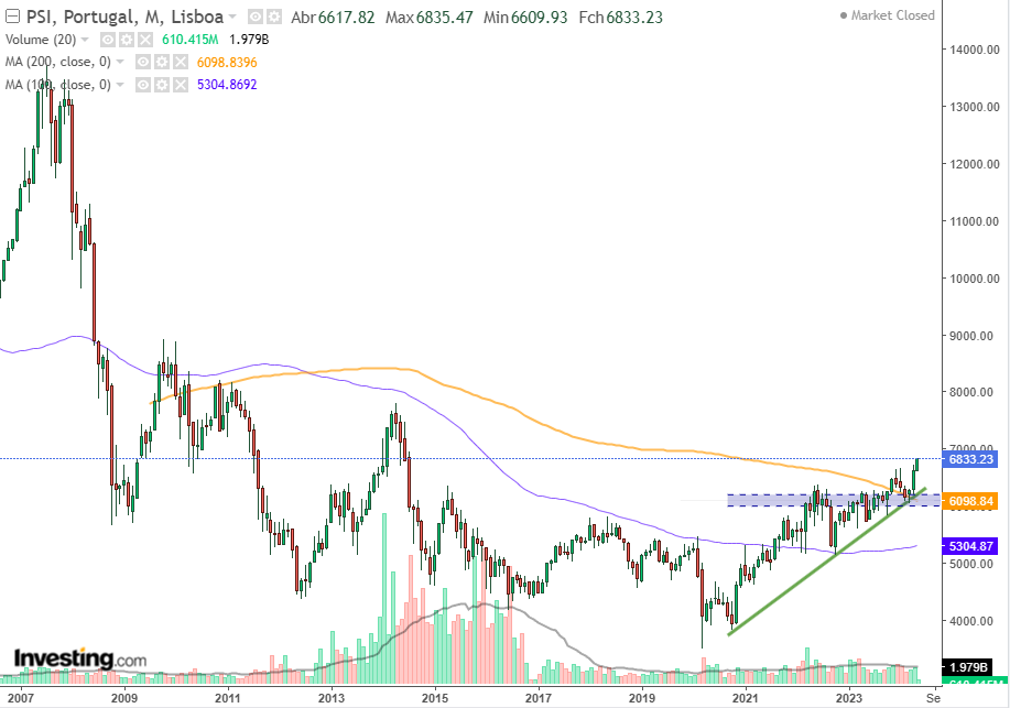 Acima dos 6720 e a subir mais de 1%, o PSI visita valores que não se viam desde Julho de 2014. Estes valores atingindos nas últimas sessões são máximos de quase 10 anos.