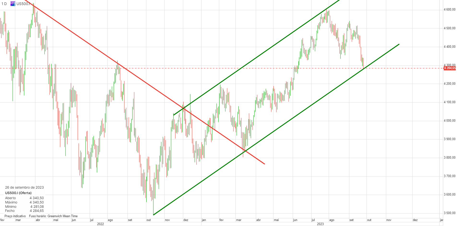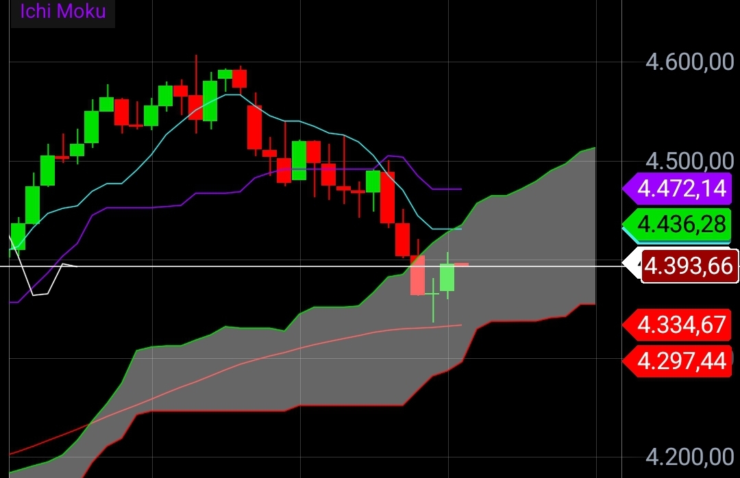 Quebra do suporte e ida ao objetivo. Agora haverá uma reação, mas chegados a 4350 os ursos podrão de novo mostrar as suas garras. Esta quebra é para mim um sinal baixista.