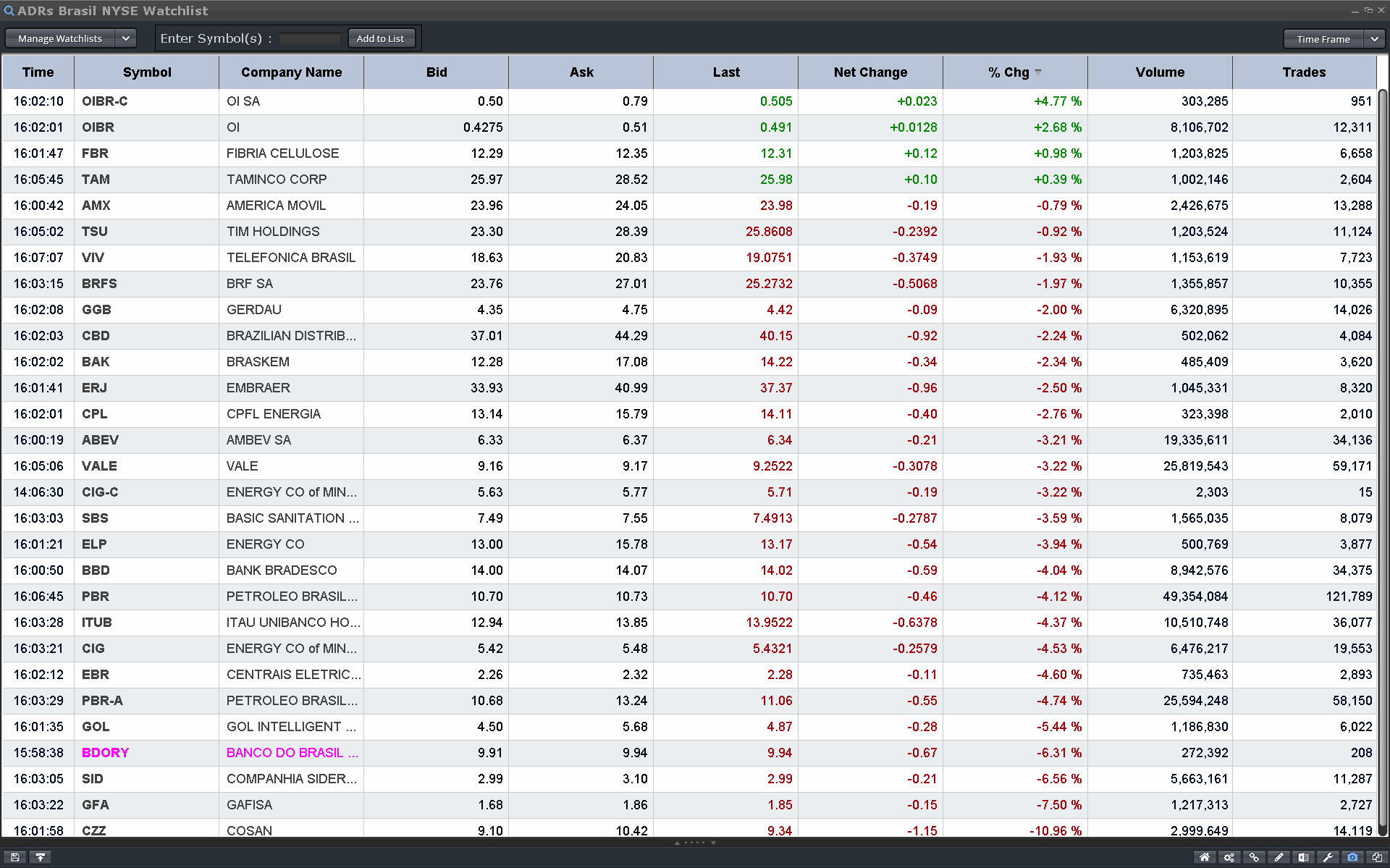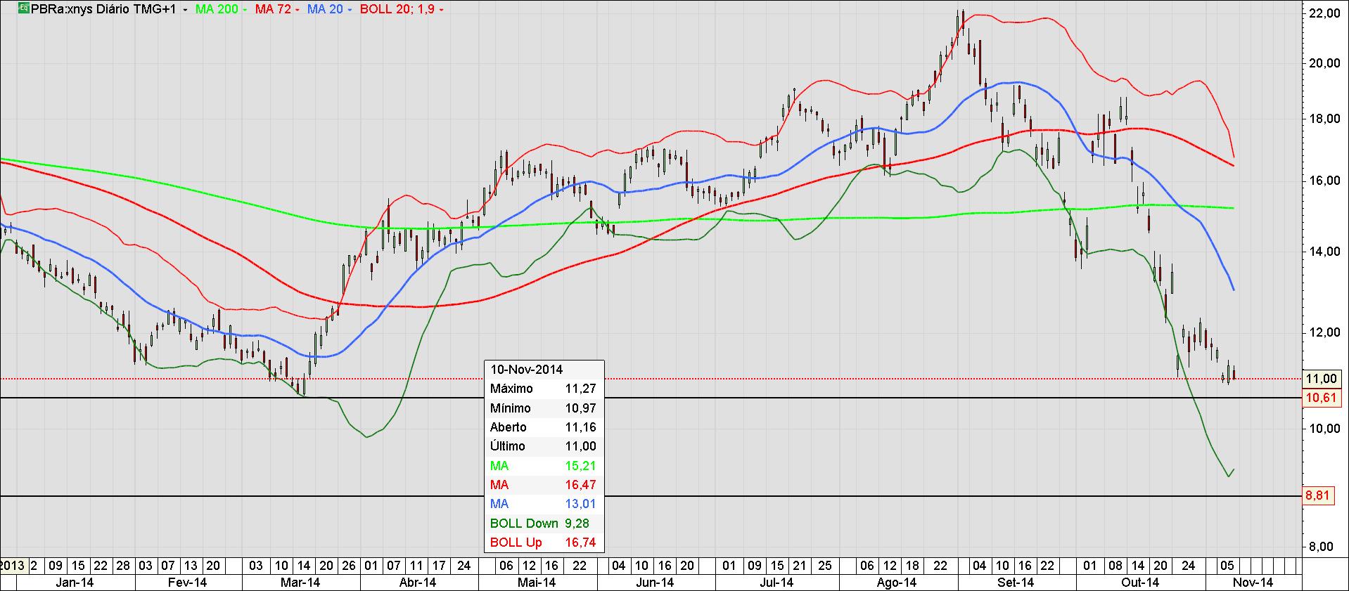 Aqui e em todos os casos das cotadas ADR Brasil, não há demasiadas preocupações, principalmente estando comprado no ITUB. Se ele escorregou, mais que natural na generalidade do cenário. Para os Bancos e financeiras privadas, pouco ou nada há com que preocupar-se. Ela volta ao padrão, aos soluços e devagar, mas o ITUB retorna aos 15,60 usd, e será rápido e consistente, há que aguardar as decisões politico administrativas, nomes de ministeriáveis e fundamentais de vocação politica do que contábil financeira. O ITUB mais alguns dias vai explodir seus lucros pela positiva, pois a tendência dos juros COPON e SELIC, vai se dar mais um aumento em 0.25%, no miminho e a cada vez que isso acontece, são lucros astronómicos para os bancos e na contenção da inflação. O mesmo já não podemos falar da PBR, que está sendo esventrada e não lentamente. Mais ou menos que a cada 0.1% de queda do preço do petróleo há uma perda de caixa de 100 milhões USD na PBR. Já lá vai em 65 bilhões até a ultima cotação de 80usd/barril que já caiu mais 3 pontos entretanto. O ITUB não, se os juros sobem, ele fatura mais ainda, se desce fatura um pouco menos, mas o padrão do ITUB é o todo poderoso do Sul, mas até haver uma estabilização do cenário, vai ser isso que estamos a ver, um grande vazio de atos decisórios é uma queda de braço entre o Governo e ele próprio. O Governo está fazendo uma demonstração de força e permitindo que as composições se encontrem. A minha opinião é que a partir do momento que as respostas forem dadas ao mercado pelo Governo eleito, o mercado vai reagir positivamente e especulativamente para alguns gap ups e então finalmente, vai descer o morro e esparramar-se no asfalto. E uma vão puxar as outras será inevitável. Poderá haver menos sintomática situação para as cotadas mais afastadas do Governo, ou as não estatais e as com menor participação do governo, mas na minha opinião o mercado não irá aguentar-se. Vai ser fogo de palha, pequenos gap-ups até a formação e clarificação da tendência que não será outra a não ser a tendência de baixa. Os números e resultados estão péssimos, com algumas excessões que não são suficientes para manter uma tendência de alta. Não se trata de otimismo ou pessimismo, são os números e os fatos, e para uma inversão de tendência, há muito a fazer.