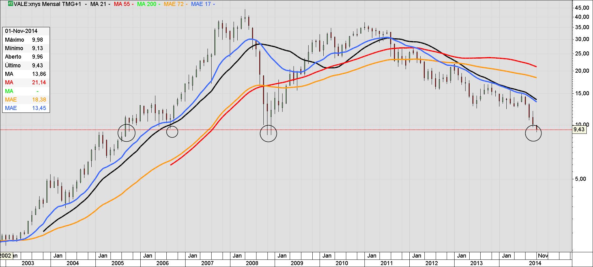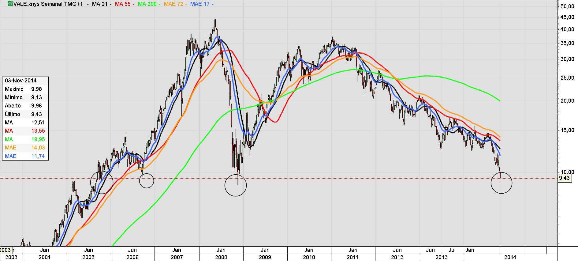 Aqui nestes toscos gráficos poderemos observar esses fundos, que não há por onde se pegar. É o limite da existência entre um improvável sucesso de curto prazo, o menos improvável medio prazo e poderíamos ter algum sucesso num prazo mais alargado dependente da reação económica global. A VALE e todo seu potencial como na generalidade do portfolio Brasil, portfolio este representado pelos ADRs NYSE Brasil, porque não é o mesmo que se verifica se conseguíssemos ter acesso a generalidade das cotadas do IBOVESPA que é um grande negócio. Temos no IBOVESPA cotadas a fazer belos números antes, durante e após as eleições, de maneira consistente, com bons fundamentais e excelentes perspetivas de futuro. É inevitável falarmos da politica económica mundial e a filosofia da politica nacional brasileira e seus projetos para o planeta. Poderá ser aqui a grande diferença entre a ação e a reação. O Brasil está agindo e o mundo reagindo. É um misto de exercício do domínio entre o dominado e o revolucionário. Complicado não é? Não, não é.