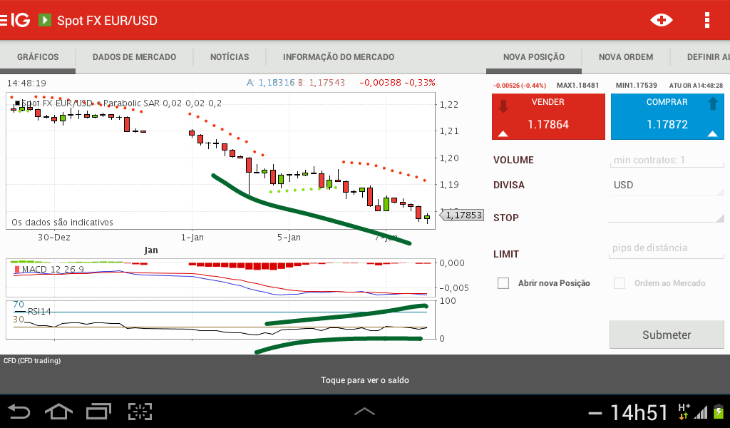 As divergências positivas no gráfico de 4h estão lá de facto... mas para já não troco os Curtos pelos Longos, vamos ver como vai fechar o diário, mas esta segunda vela de 4h também está a mostrar uma certa força... O Preço foi aos 1,175 e acho natural estar a reagir agora em alta já que aquele é um suporte importante depois de os 1,20 e 1,19 terem sido comidos com incrível facilidade. Curiosamente ontem também a vela das 16 horas parecia querer mostrar que havia ali um fundo nos 1,18, mas depois o Preço voltou a descer para novos mínimos, as divergências também já lá estavam. É aguardar a assistir, mas para já acho que esta subida foi um toca e foge ao suporte para ir lá mais vezes e furá-lo.