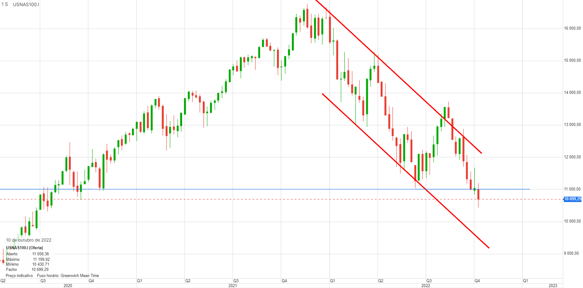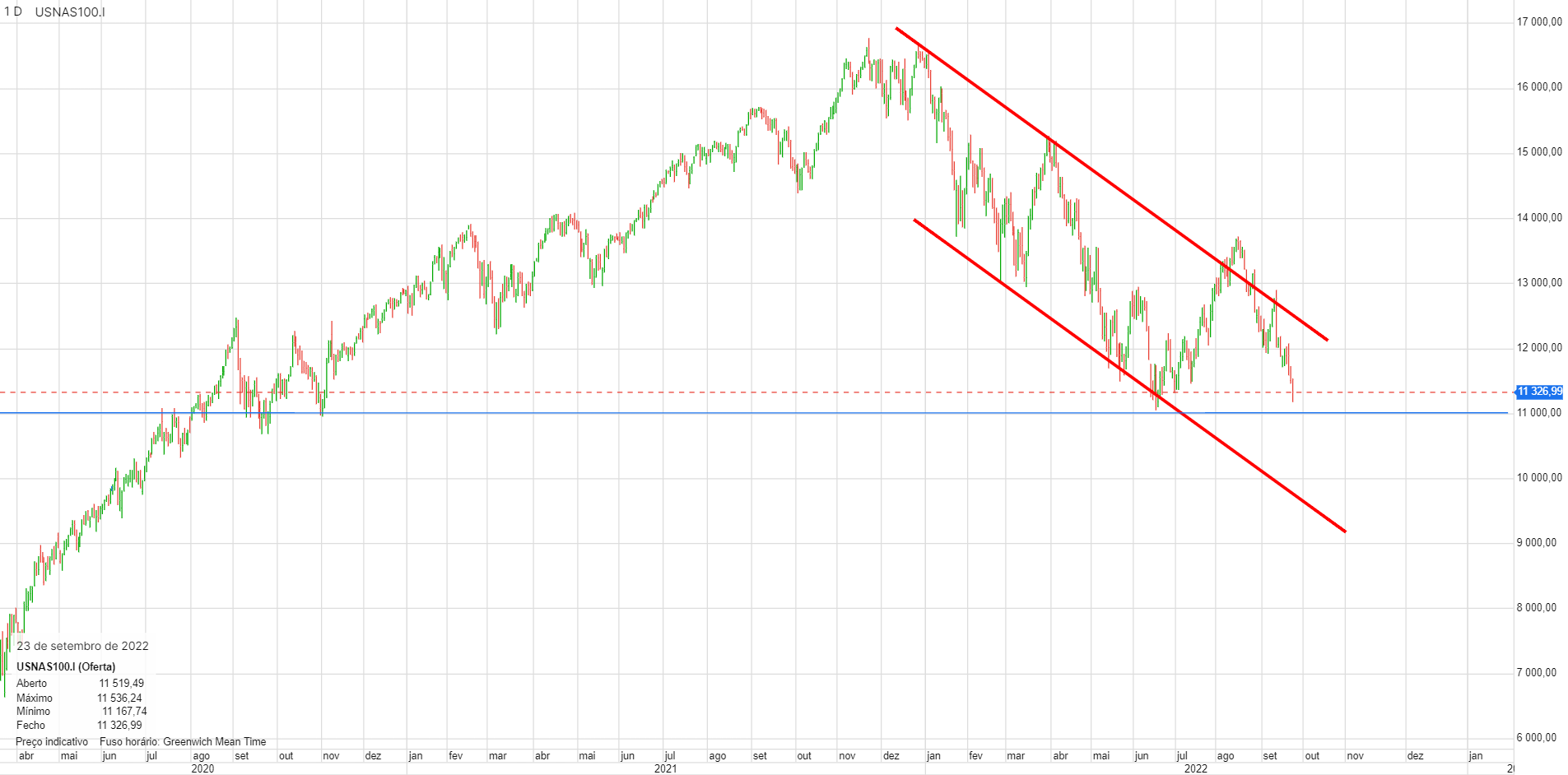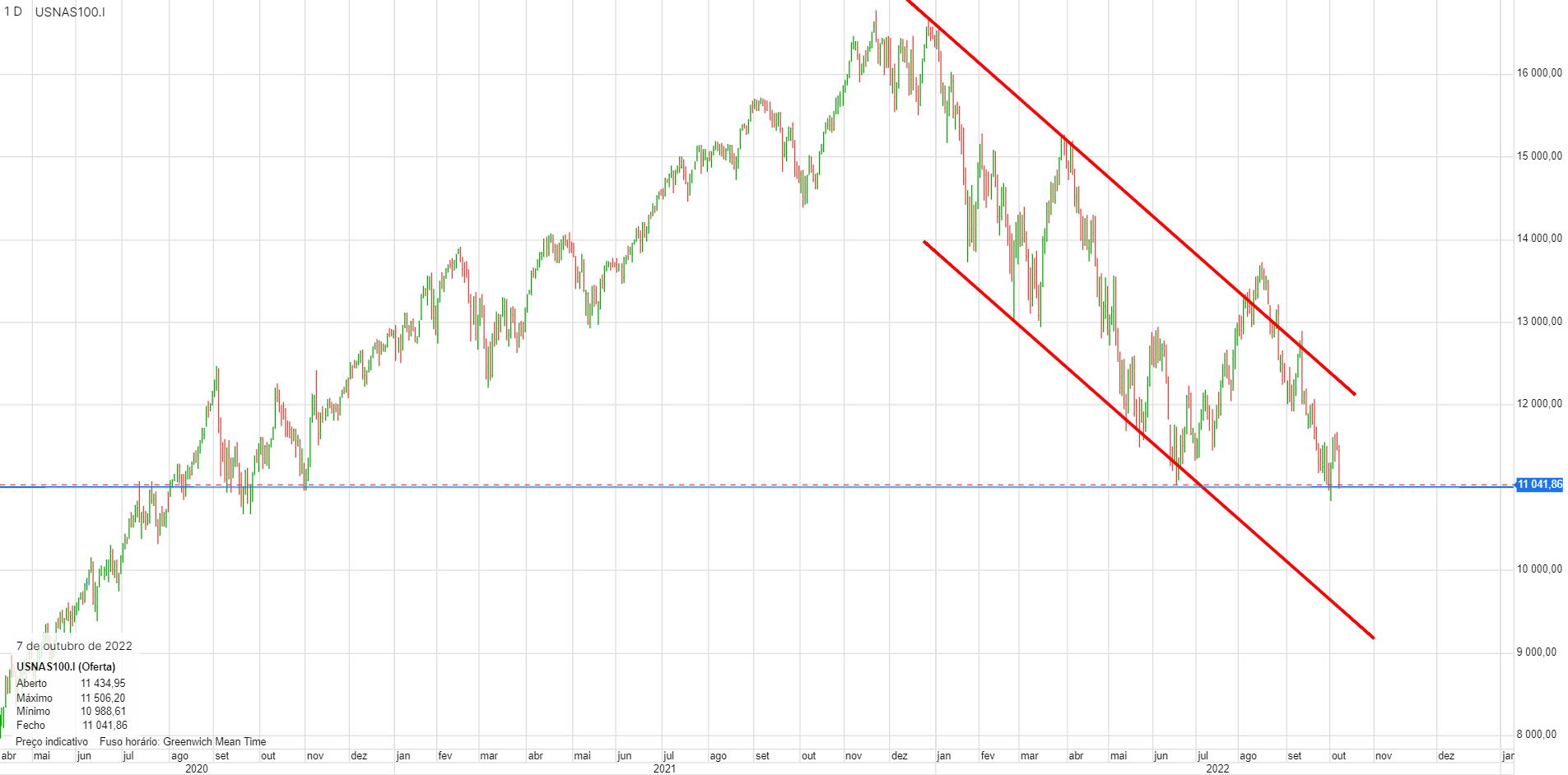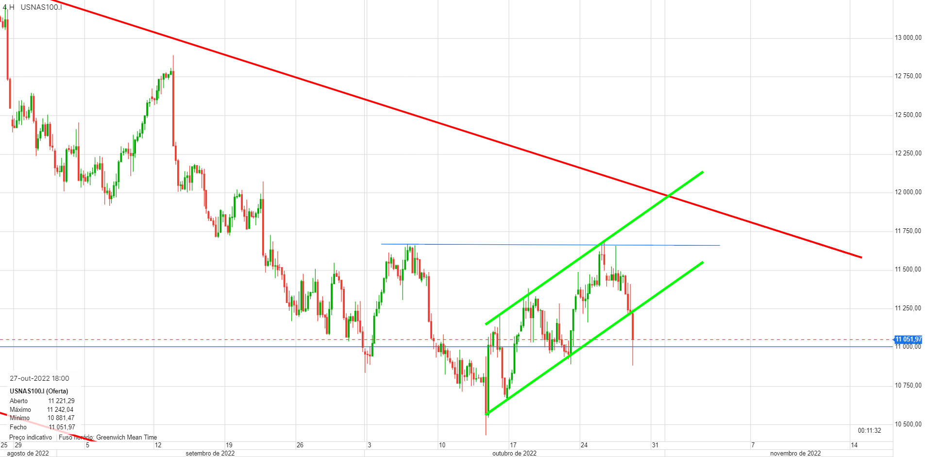 Àlvaro Escreveu:Nirsup, o Nasdaq100 prepara-se para furar os 11 000 pontos e deverá ser já hoje. A coisa tem aspeto de querer vir mais abaixo, é isso que diz a tendência e os números do emprego ajudam muito poia assinalam inflação.Um fecho abaixo de 11000 poderá significar uma queda mais profunda.