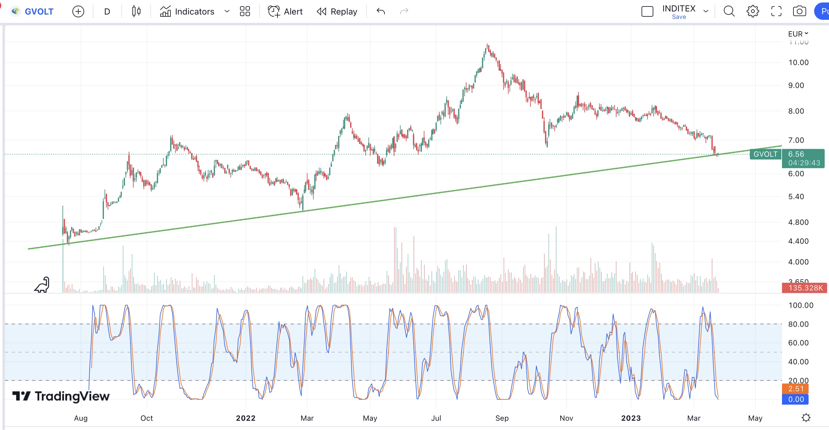 Não é matemática, mas parece finalmente estar a ficar com bom aspecto. Penso que se passar os 7.30, zona de resistência nos ultimos dias, e zona onde está a MA20 no diário (7.33), pode desencadear forte subida.