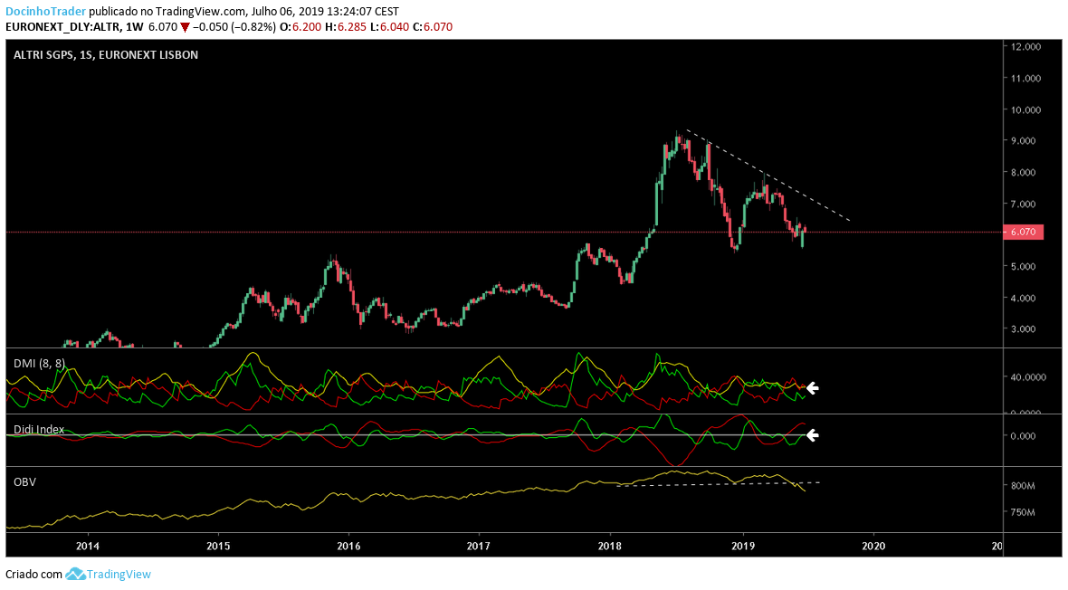 O OBV perdeu o anterior suporte o que não é um bom sinal,estamos ainda vendidos nos indicadores semanais e acabámos der ter uma compra falsa no didi índex.A manter esta situação iremos quebrar o anterior mínimo.