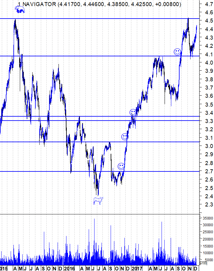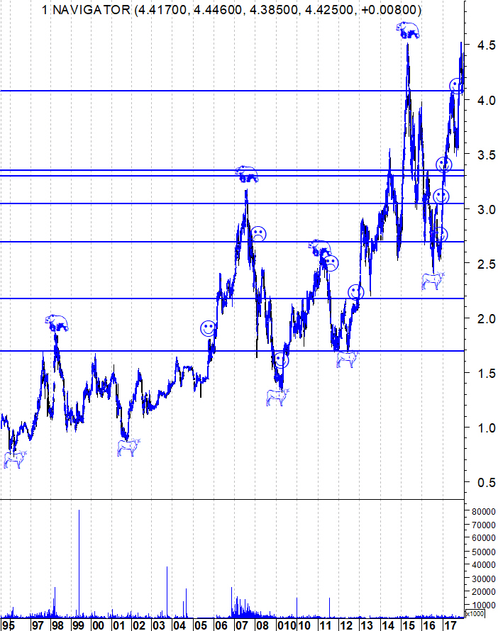 Apenas anuais. Ainda tem que se chegar um pouco mais longe. O próximo passo vejo uma resistência pelos 4,5x (onde se ficou em inicios de Novembro) e os máximos históricos por bater nos 4,76.