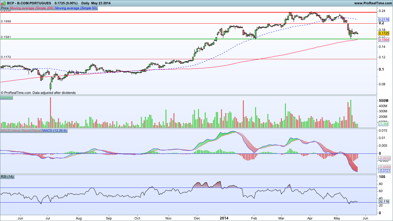 Parece-me que pode haver aqui um intervalo para se negociar longo. Os 0,158€ aguentaram a cotação e a resposta foi com força. Para quem está de fora e trata o risco por "tu", poderá ponderar uma entrada por estes dias com stop no último mínimo relativo e ponto de referência nos 0,20€. Para quem não gosta de correr tanto risco, para negociar longo talvez o melhor seja esperar pela quebra em alta dos 0,20€. A relação de 2:1 não me desperta especial interesse, sobretudo quando uma questão tão importante como um AC ainda está tão indefinida.