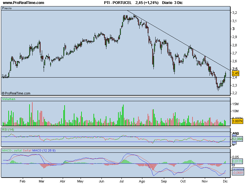 A linha de tendencia descendente ainda não terminou. Na minha perspectiva, o gráfico indica que se quebrada a LTD, nos 2,50, o título poderá ter caminho livre até aos 2,82, com resistencia nos 2,60 (mais coisa menos coisa). Não tenho posição, mas como disse, estou atento.