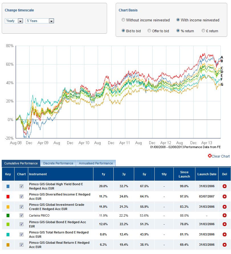 Para retornos anualizados em EUR, usando dados da Morningstar/Banco Best, através do ficheiro Excel que foi disponibilizado em 2013-08-03, simulei a "Carteira PIMCO" com os pesos iguais para todos os fundos.