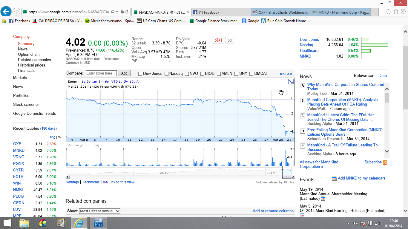 MNKD - e agora o que se deve fazer, vender, aproveitando este brinde, vender 50% e aguardar no que vai dar, ou não vender nada e colocar um stop, mas depois pode abrir com um grande gap e lá se vai o brinde, o que faziam neste caso.