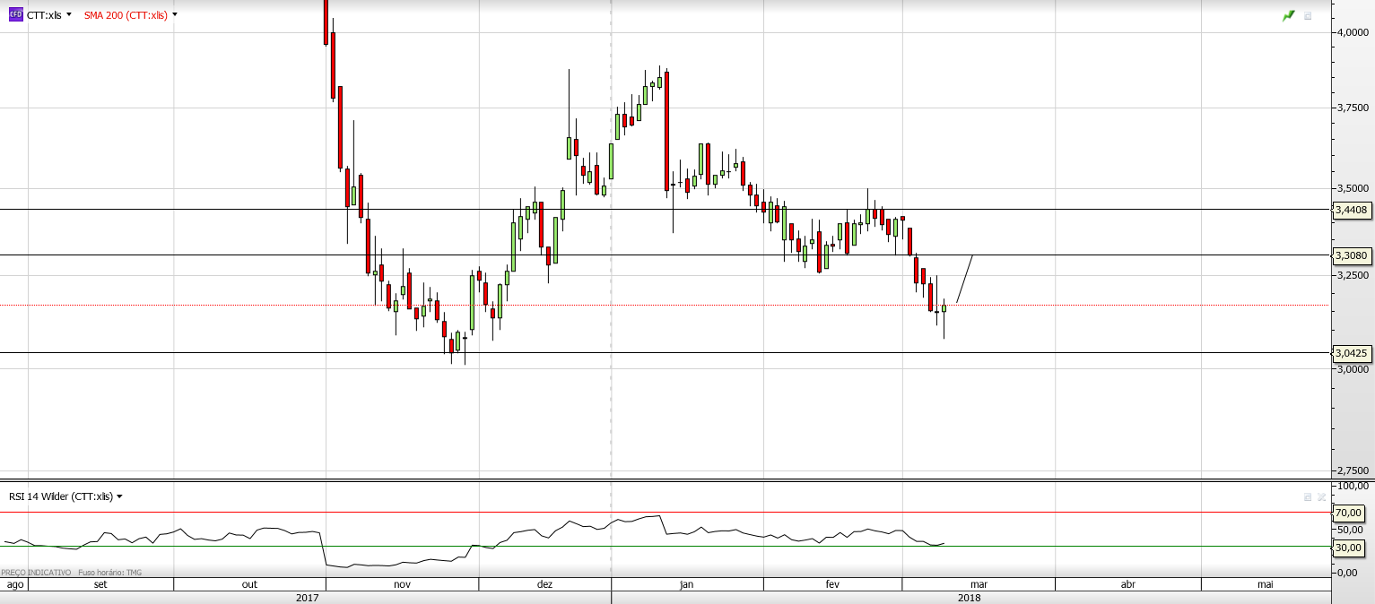 Vale, esta tentativa de espalhar o pânico é manifestamente exagerada. Acredito que os títulos atinjam mínimos históricos pois a força vendedora é grande e, pasme-se!, não sai uma única notícia favorável aos Ctt's. Para além da geringonça, onde os comunistas mandam que se fartam, há coisas que têm corrido mal e esta provável guerra comercial é uma dessas coisas pois, por via dela, os juros vão patinar -a este facto também não é alheia a queda do Bcp-. Tens ainda a favor da tendência uma possível retracção nos índices que poderá até ser forte se a tentativa de proteccionismo subir de tom. Mas muito abaixo de 3 euros não creio, sei que o fundo desse canal é abaixo, mas penso que só alguma surpresa negativa daria força aos ursos para lá chegarem. E até pode acontecer uma viragem violenta nesta descida e sabes bem que os curtos estão com um olho para cima e outro para baixo e têm as ordens colada à linha. Portanto... não te estiques, não te estique para além de 3. Entrar antes disso poderá ser alimento para ursos, mas por aí voltam a levar pazada na cabeça para ficarem mais mansos.