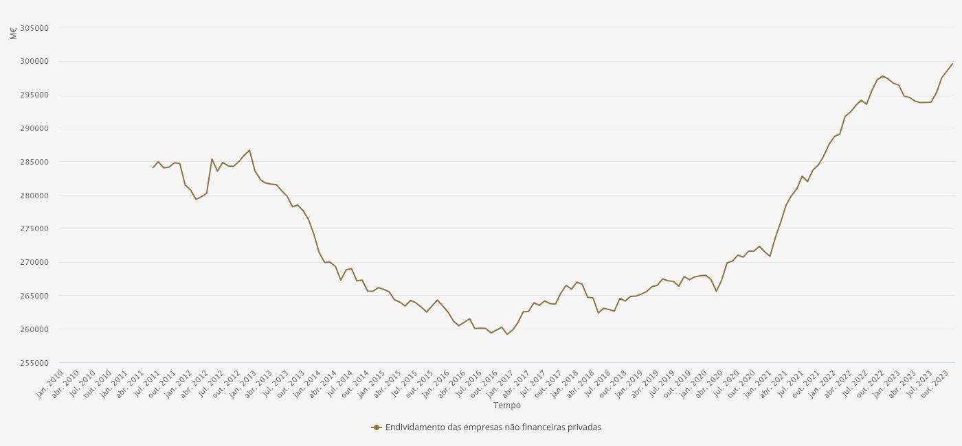 De vez em quando gosto de consultar dados estatísticos publicados no site do Banco Portugal. Hoje vi a evolução da dívida no sector privado não financeiro. É estranho a dívida subir tanto num período de subida de juros, não?