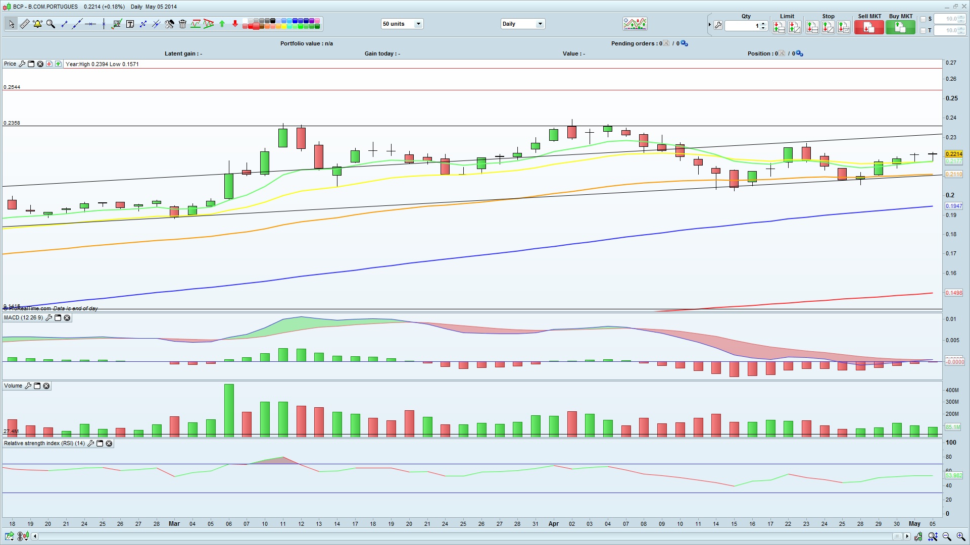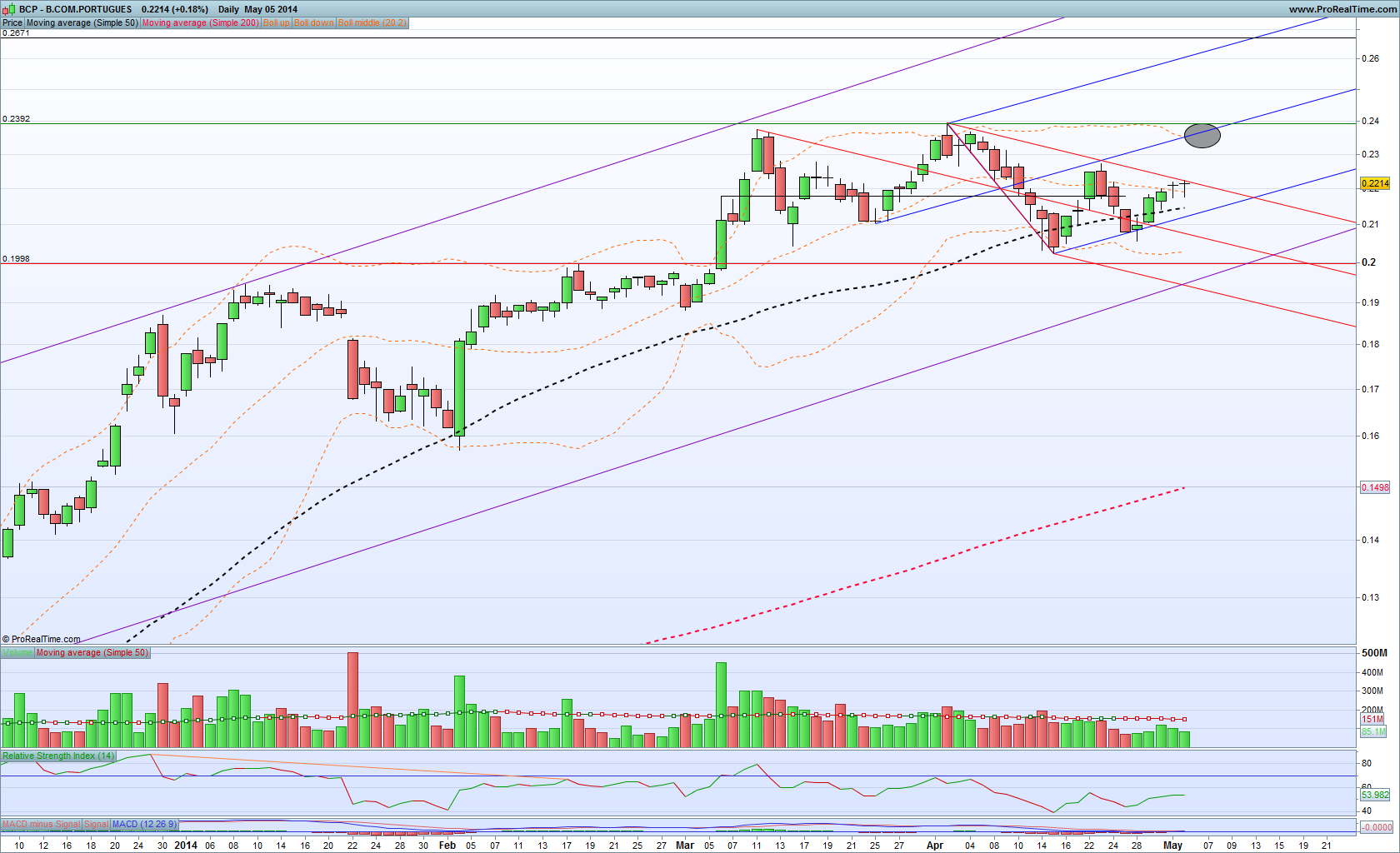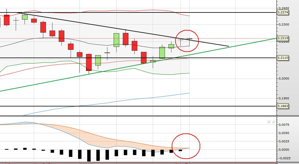 Coloquei duas linhas a vermelho mais lá para cima: a primeira a 0,255 corresponde ao fecho de um gap que remonta a meados de 2011 e a segunda um pouco mais acima onde me parece existir uma ligeira resistência na casa dos 0,265.