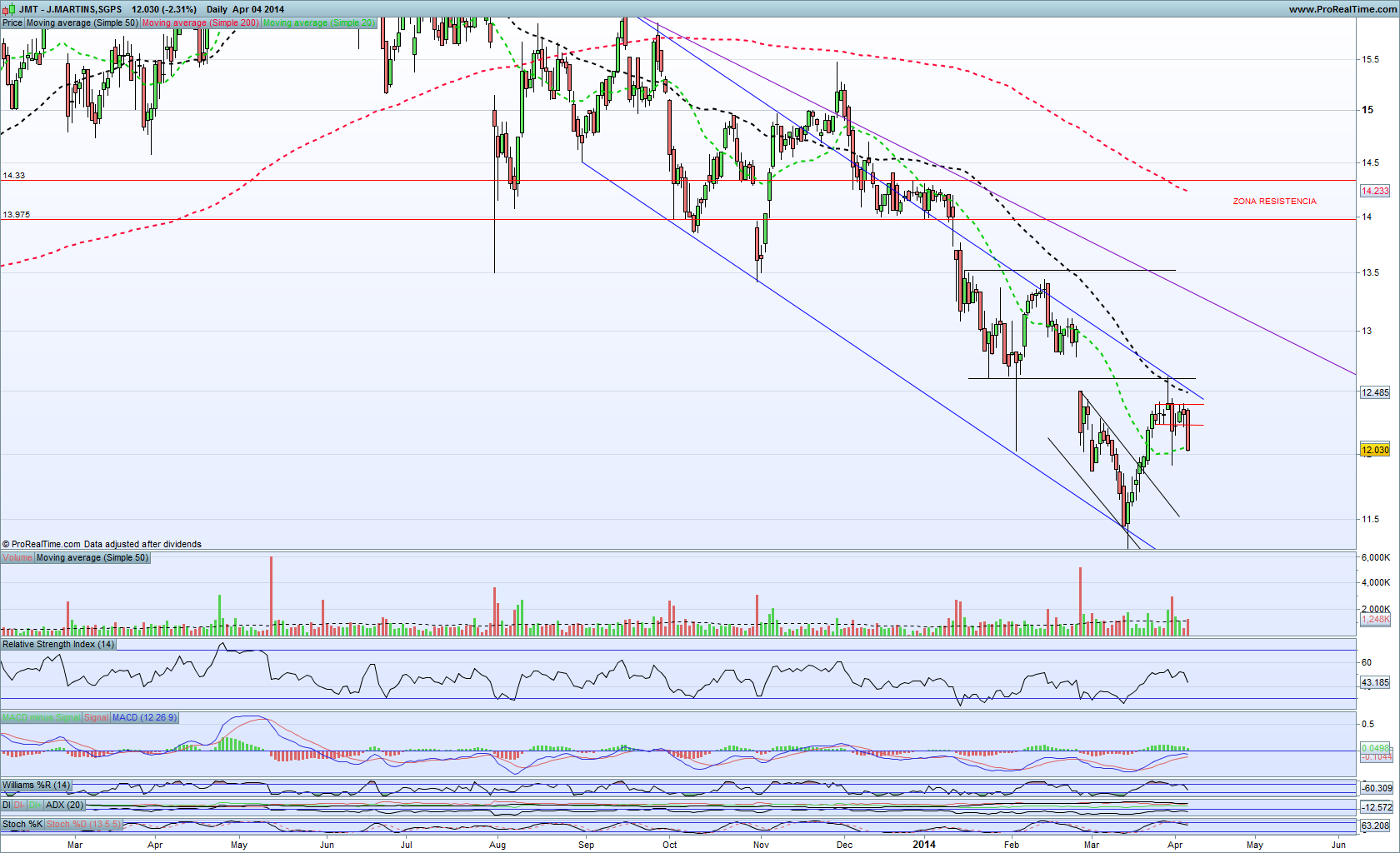 Ora bem nos ultimos dias o papel andava a fechar e abrir naquela zona vermelha dos 12.200 a 12.400, com vários picos altos e baixos no intraday, no entanto hoje quebrou esse ciclo em baixa, com uma vela preocupante e com um volume médio, provavelmente será uma reacção ao topo do canal ascendente. Já quebrou em baixa a MM20 e se não reagir imediatamente o mais provável é ir-se debater com o fundo do canal.