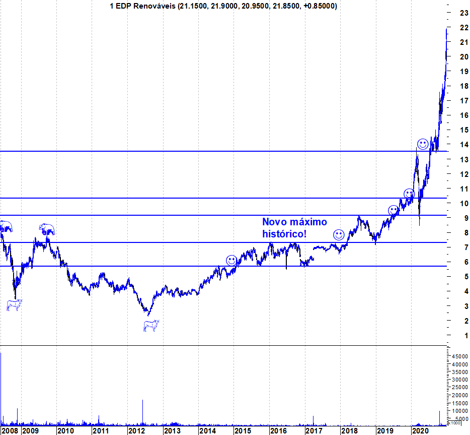 Para ilustrar melhor o que aqui vai sendo discutido deixo o gráfico desde a entrada em Bolsa da EDP Renováveis. Ela valorizou-se mais de 800% nos últimos 8 anos e meio.