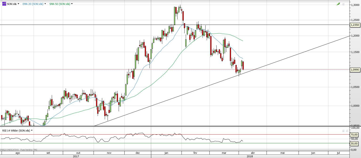 SON faz recuperação até resistência no topo do canal descendente que vem desde meados de JAneiro nos 1.13