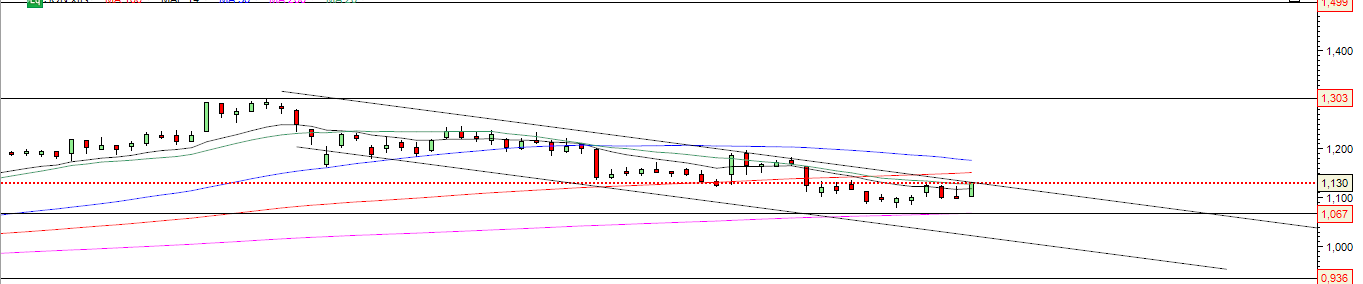 Cotada em cima da LTD de curto prazo, com um RSI aliviado, MACD a efetuar cruzamento entre linha MACD e linha de sinal e DMI a apresentar uma aproximação entre DI+ e DI-, diria que os búzios estão a adivinhar uma quebra desta LTD e uma paragem aos 1,15x€.