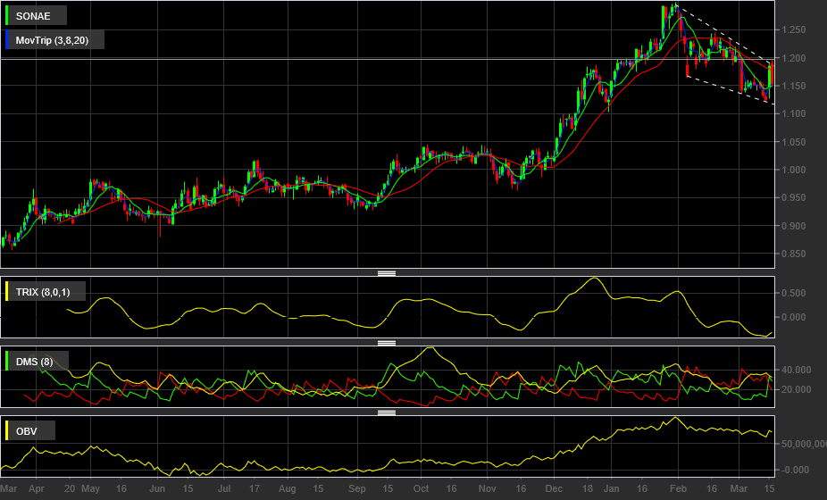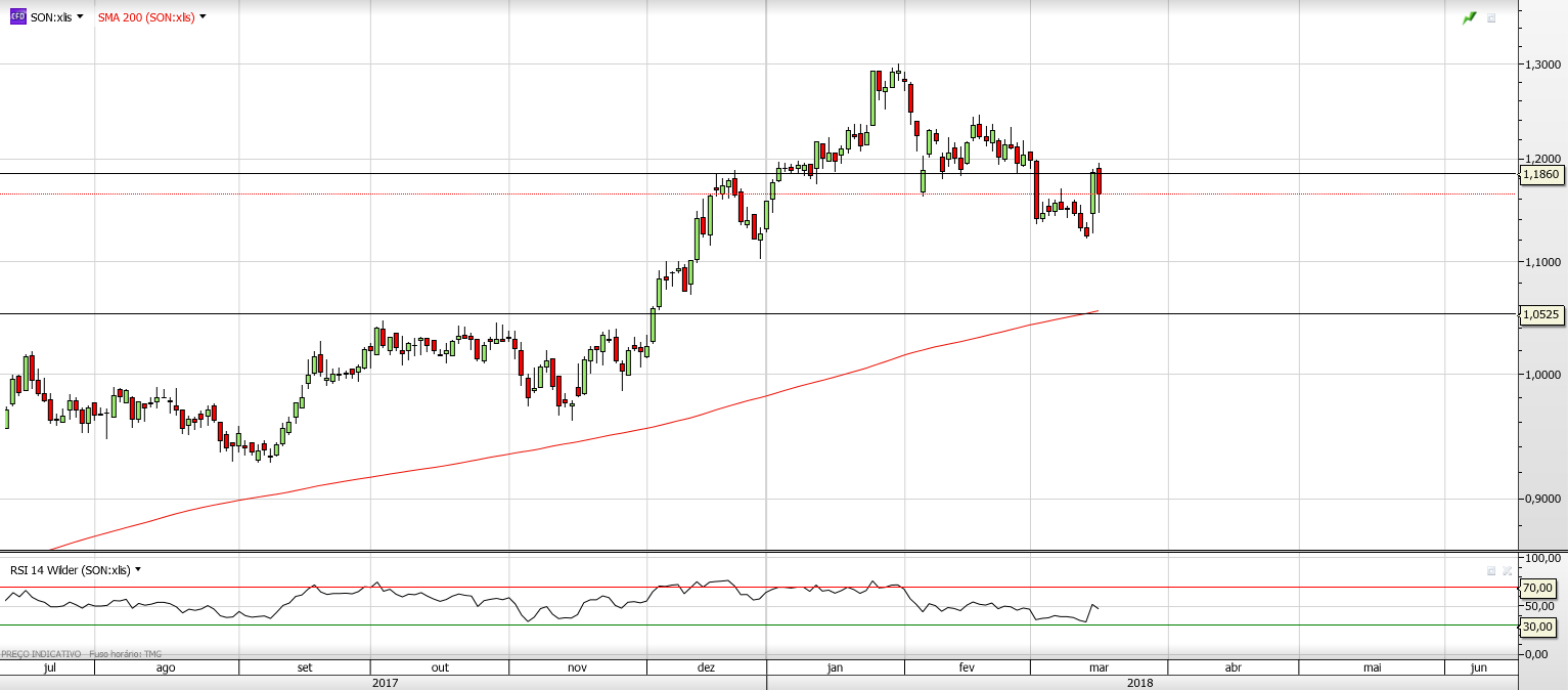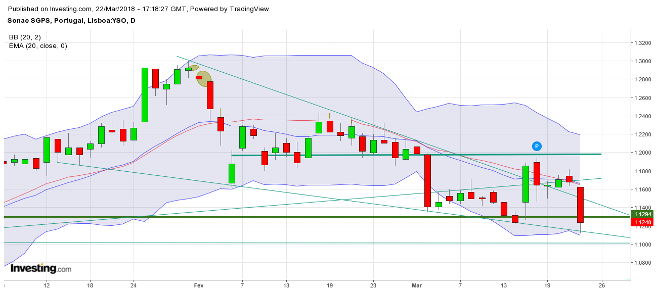 A Sonae ainda continua num processo corretivo com topos e fundos descendentes, estando neste momento a lateralizar entre 1.10€ e 1.18€,sendo suporte e resistência respetivamente em GANN.