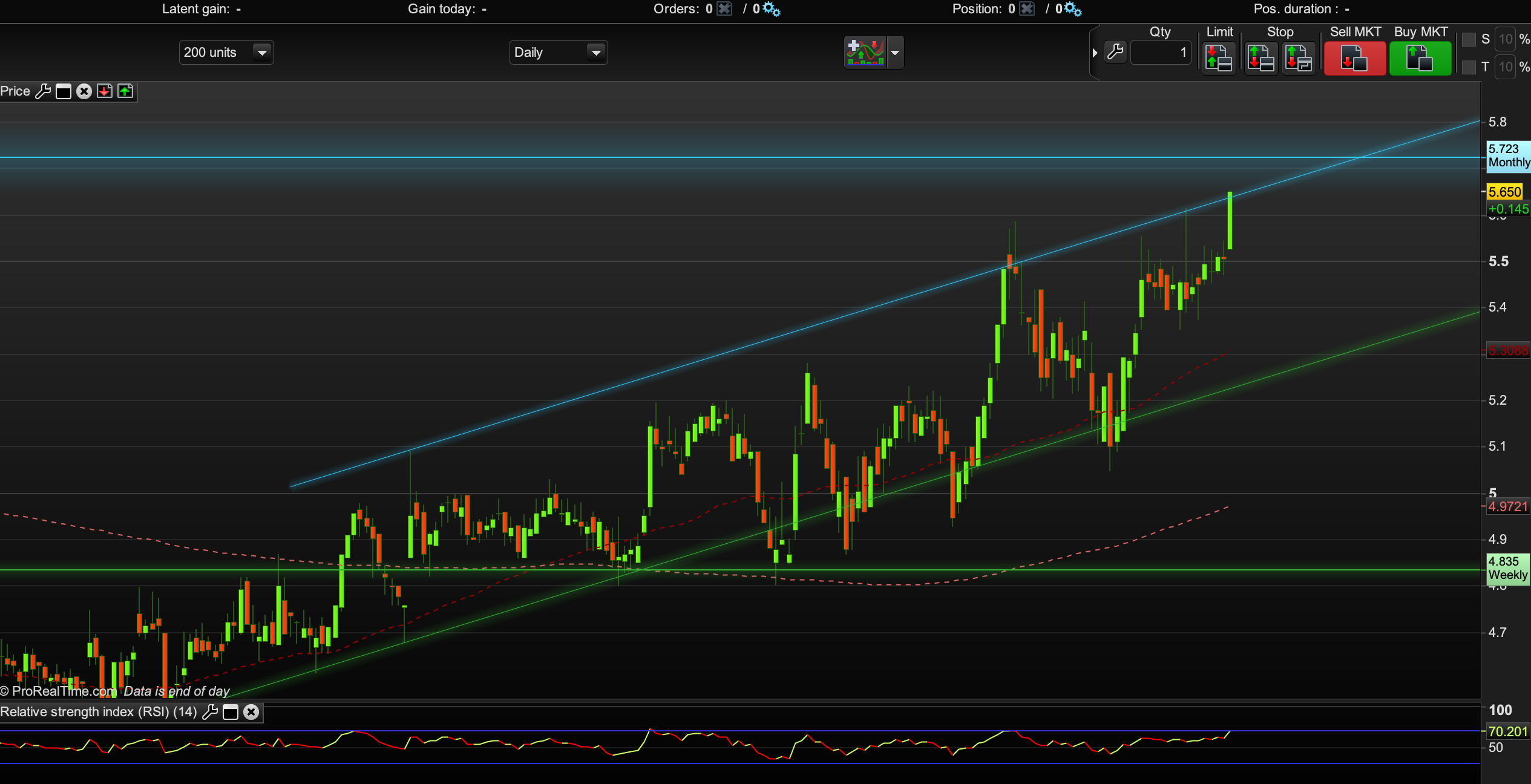 Mas nao creio que desca dos €5,0x onde há um ligeiro suporte no diario e que representa uma correcção saudavel de 12,x%.