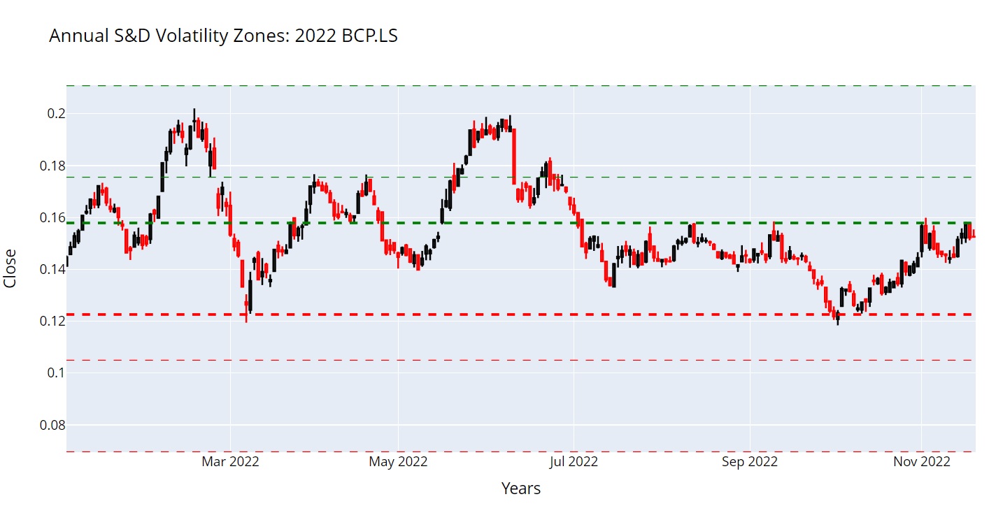 Com base em aprendizagens recentes em outspokenmarket.com deixo um gráfico com umas linhas a tracejado que podiam ter sido desenhadas no início de 2022 com projeção para todo o ano de 2022. Representam zonas de suporte e resistència com base em volatilidade. A linha mais larga tem um desvio de 0,5 e as outras duas de 1 e 2 desvios. Começar o ano com estas linhas desenhadas tinha sido muito interessante!