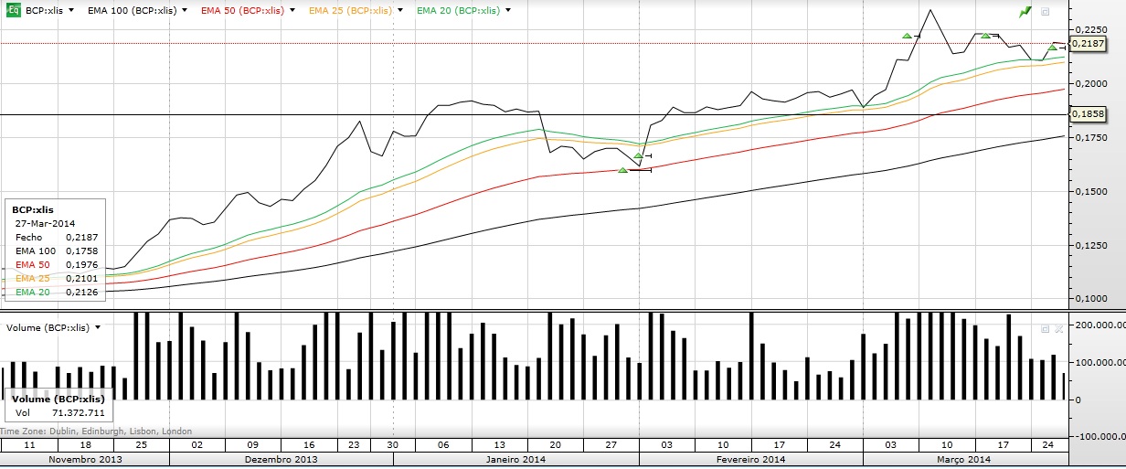 A força que o BCP teve a fechar indica-me que poderá estar ai alguma noticia importante na forja. Mas isso pouco me importa. Assim que atingir uma rentabilidade interessante poderei vender e entretanto já estou à espera da próxima EMA. E com isto vou ganhando consistentemente dinheiro ao longo do ano.