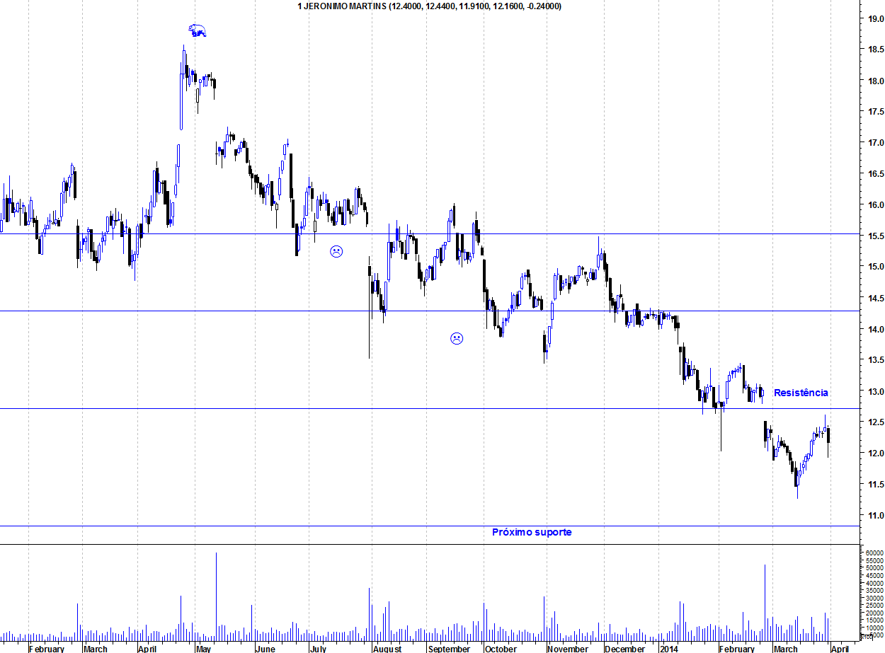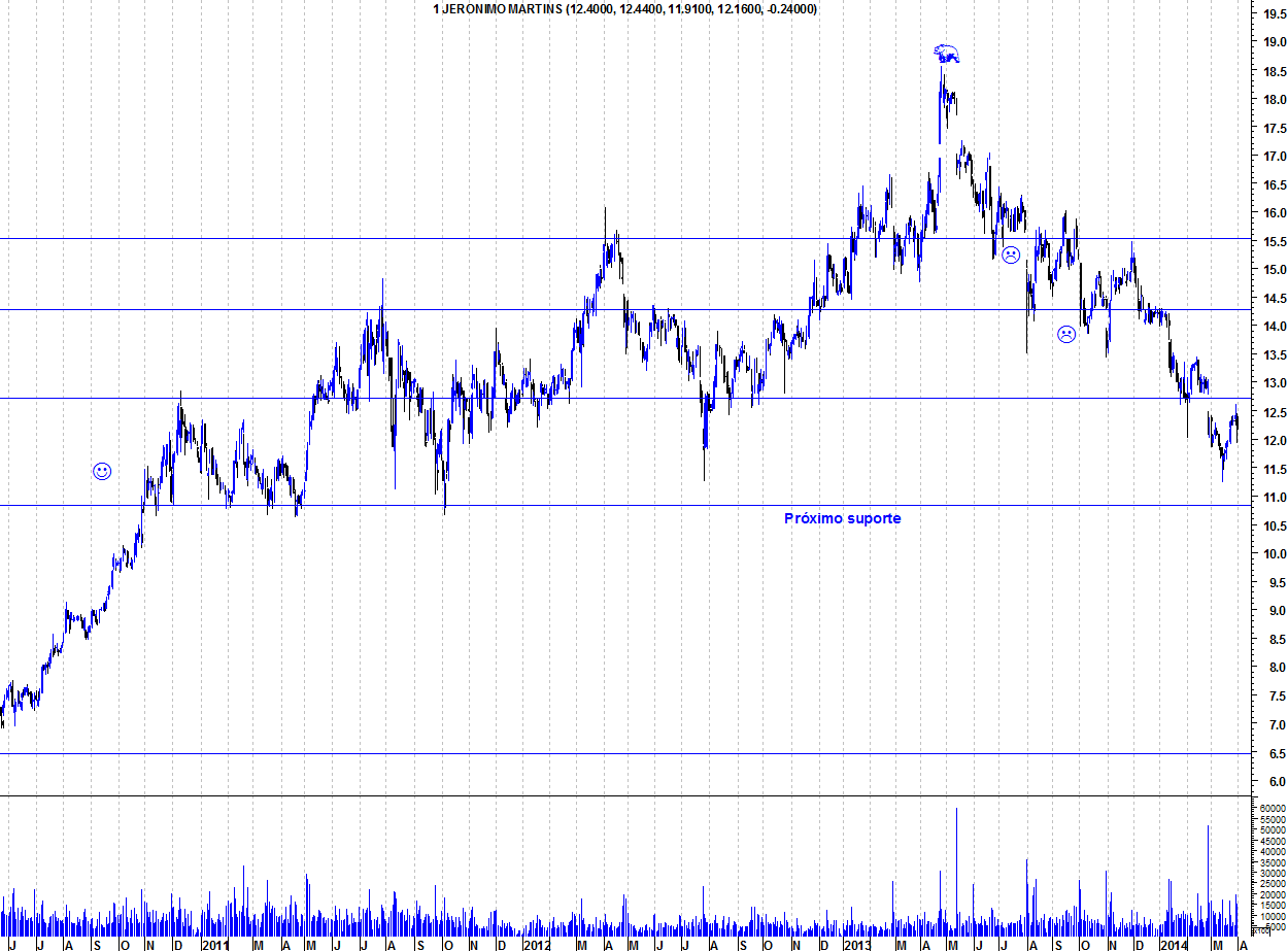 Ulisses Pereira Escreveu:Tenho estado "bearish" na JM há alguns meses. Serão precisos sinais de força da acção para eu me tornar "Bullish". Nesta altura, a zona de resistência mais próxima situa-se entre os 12,7 e os 12,8 euros. Uma ruptura consistente dessa zona iria levar-me a despir o fato de urso, tornando-me neutral na acção e esperando pela quebra de mais uma resistência para me tornar "Bullish".