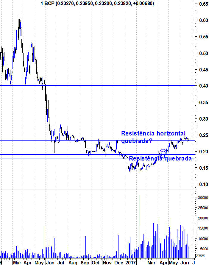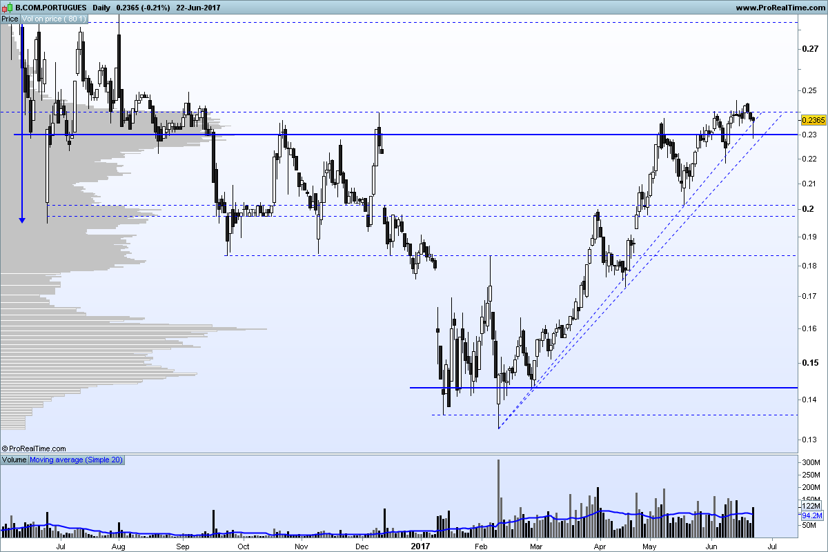 De facto essa linha está lá, mas creio que perde relevância face à grande resistência que são os 0,24 e que me parece ainda ser a grande barreira às subidas da cotação, e é só por isso que não a considero no meu gráfico. Quanto a figuras, não me parece estar a fazer nenhuma sinceramente. Nem sempre duas linhas formam uma figura, acho eu. Portanto em geral estou contigo, o volume nas subidas tem sido bastante forte e este respirar sem ir muito abaixo antes de partir a resistência dos 0,24 parece-me positivo. Estou optimista e o martelo de hoje foi mais um sinal de força, mesmo com notícias aparentemente adversas. Veremos.