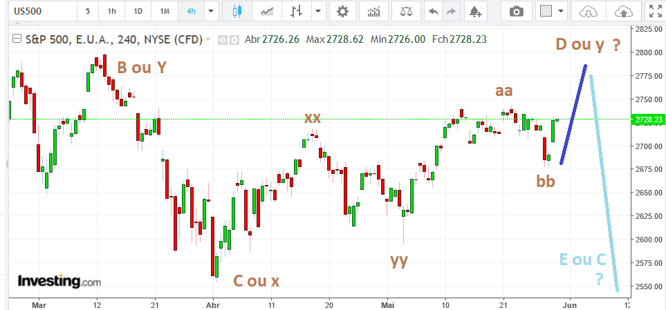 Quanto a uma visão mais geral mantenho como actualizado o que escrevi na página anterior em que me parecia mais provavel uma leg de queda para valores pelo menos abaixo dos 2600 para completar um triangulo de continuação em ABCDE ou um padrão correctivo de maior amplitude em ABC antes de retomar as subidas.