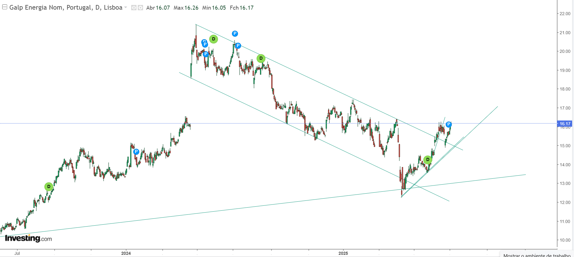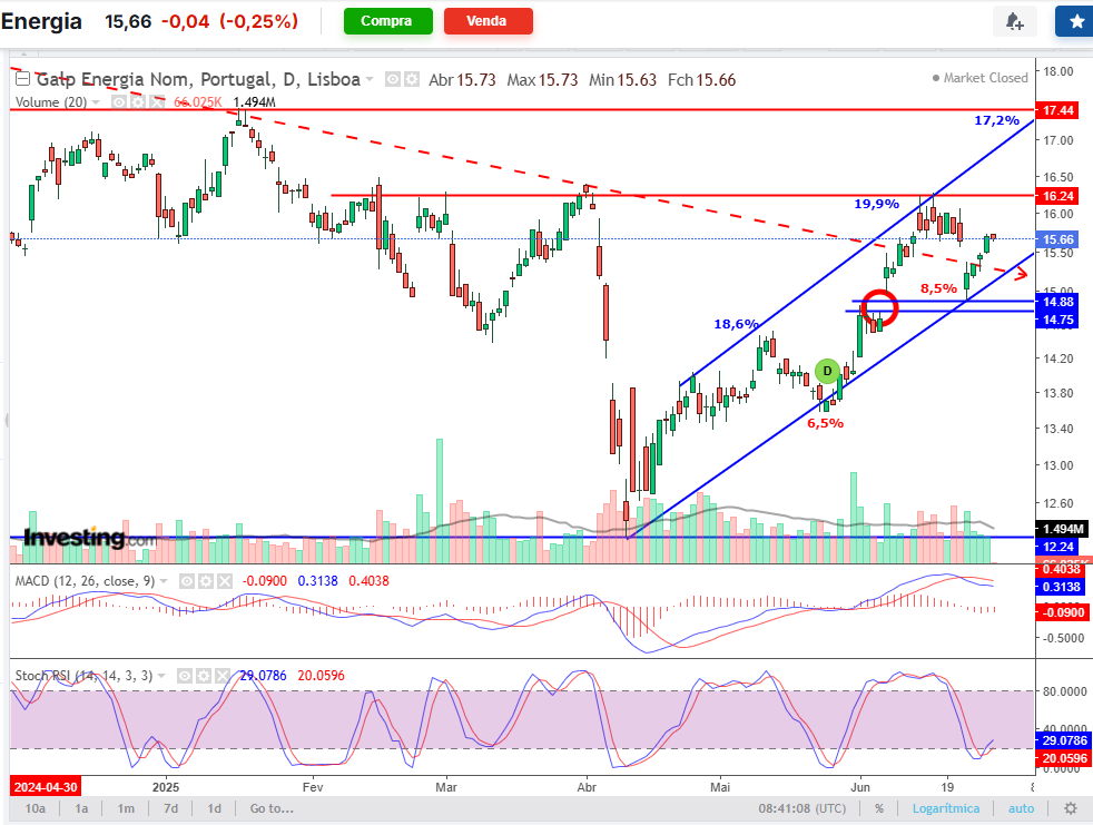 J.f.vieira Escreveu:Galp fechou o gap nos 16,66€. Correção técnica de 20–30 cêntimos parece normal antes de nova subida até ao próximo gap nos 17,195€.