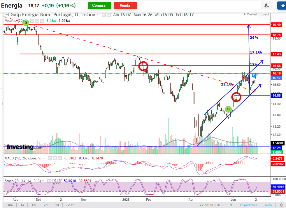 A Galp fechou recentemente um gap técnico em €16,66, e prepara nova subida até €17,195.