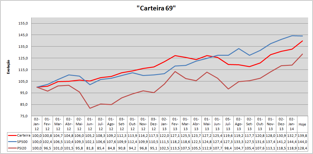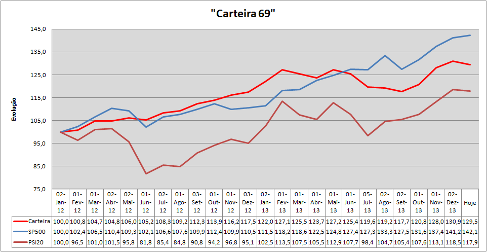 Depois de um excelente 2012 com os maiores ganhos a surgirem no investimento direto em Dívida Portuguesa, (mercado secundário), e fundos de obrigações e terminando com o aumento da exposição às acções em Portugal passámos a um lindo inicio de 2013 com valorizações espetaculares nos dois primeiros meses.