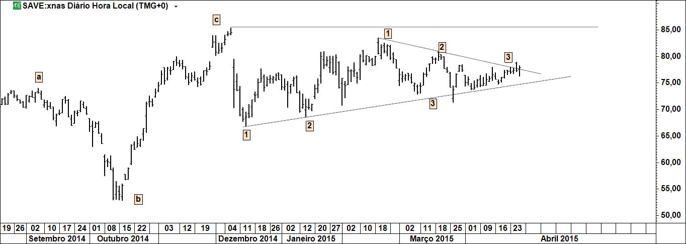 Gráfico 1: A linha azul não resultou...mas que a tendência era ascendente, lá isso era. E existia um triângulo todo janota e uma engraçada contagem de ondas. Um daqueles casos em que se verificou o lado menos bom da probabilidade. É engraçado: os livros que falam até à exaustão sobre o lado bom da probabilidade passam ao de leve sobre o outro lado.