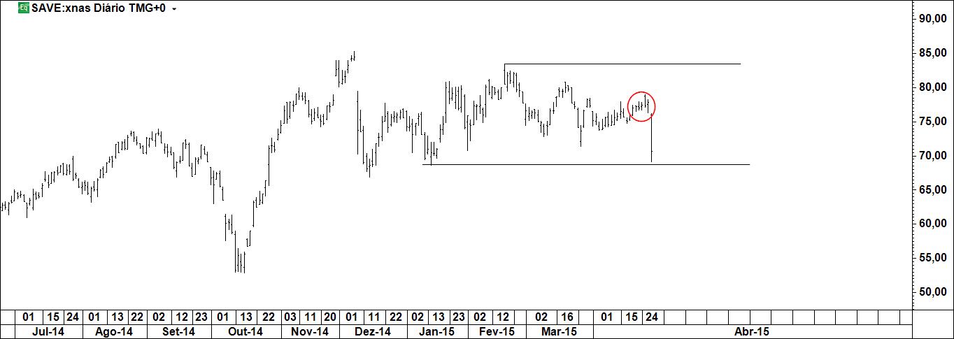 Gráfico 2: área de venda, pressupondo a quebra do suporte e subsequente correcção. Stoploss e target já identificados.
