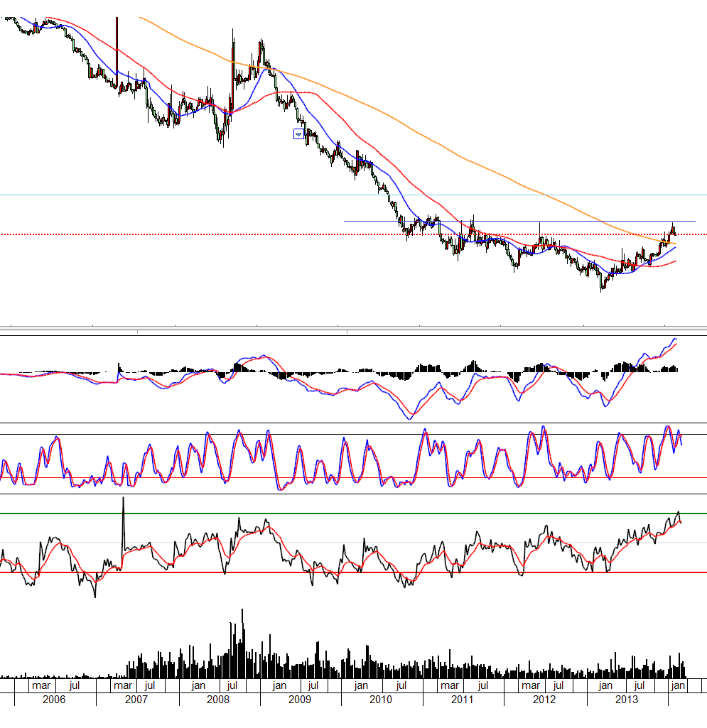 Neste caso vejo um ativo que deu sinais de inversão de tendência no médio prazo, rompeu a MM200 semanas, mas encontra-se com os osciladores (MACD, PKS e RSI de cima para baixo na imagem) em overbought e a reagir a uma forte resistência.