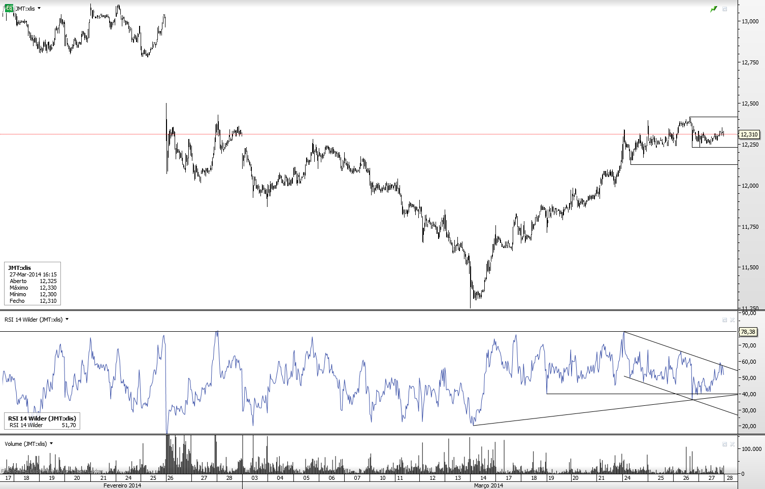 AT2014 Escreveu:mmrmm Escreveu:Sem querer ferir susceptibilidades ou criar polémicas mas não consigo compreender as expectativas geradas nos últimos dias perante a subida da JM. Sete velas positivas e uma subida de mais de 7% não são indiciadoras, em termos de AT, de qualquer inversão, suponho eu. Sendo um mero aprendiz nestas áreas, vou lendo tudo o que posso, assim quando ouvi quer o Ulisses Pereira quer o Tiago Esteves, a falaram inequivocamente em tendência bearish no curto e médio prazo (faz já quase um ano de queda) e apenas divergem nas resistências inversoras da tendência (o Ulisses aponta para os 14,3 e o Tiago para os 15), não consigo compreender a importância das resistências de 12,26 ou 12,40 que têm sido descritas. Neste sentido pedia-vos ajuda para compreender do entusiasmo dos últimos dias quando a cotada nem sequer consegui atingir a cotação do dia anterior à publicação do último relatório trimestral, nem tão pouco tem volumes de transacções sequer parecidos com o dia da última grande vela negativa de 26.Fev.