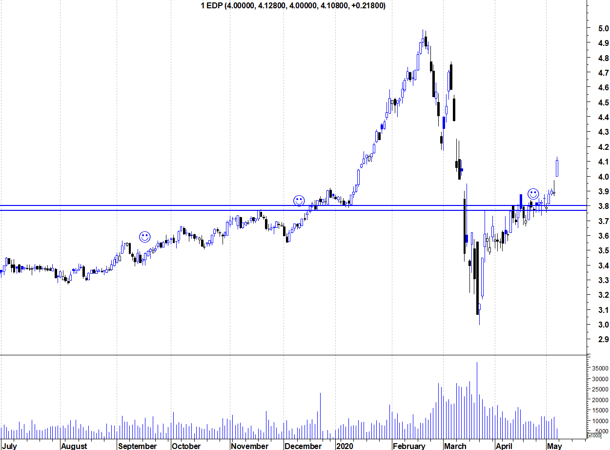 O desempenho da EDP tem sido notável. Voou no final do ano passado e no início deste ano e tem recuperado muito bem, depois do trambolhão do início da pandemia. Não nos podemos esquecer que já foi ali descontado o dividendo de 19 cêntimos, o que mostra bem o que a acção recuperou e a quebra da resistência dos 3,8 euros foi apenas mais um sinal disso.