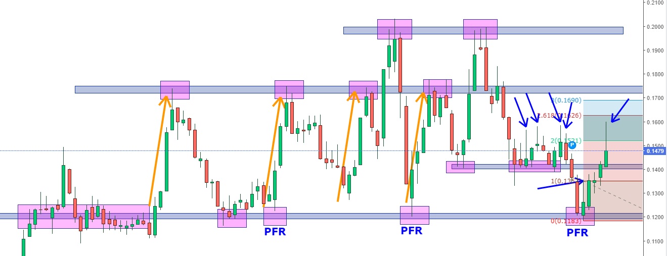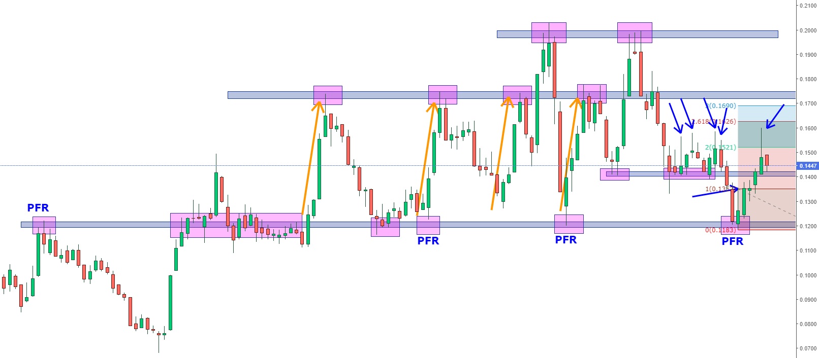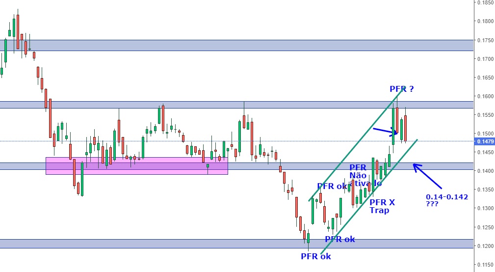 O PFR de venda deu sinal na 5ª feira, com os touros na 5ª feira em força e na 6ª feira foram os ursos que atacaram. Nos meus rabiscos, tem margem para ir aos 0.14/0.142! Este pullback até podia ser interessante para consolidar esta zona como suporte para posteior assalto aos 0.17!