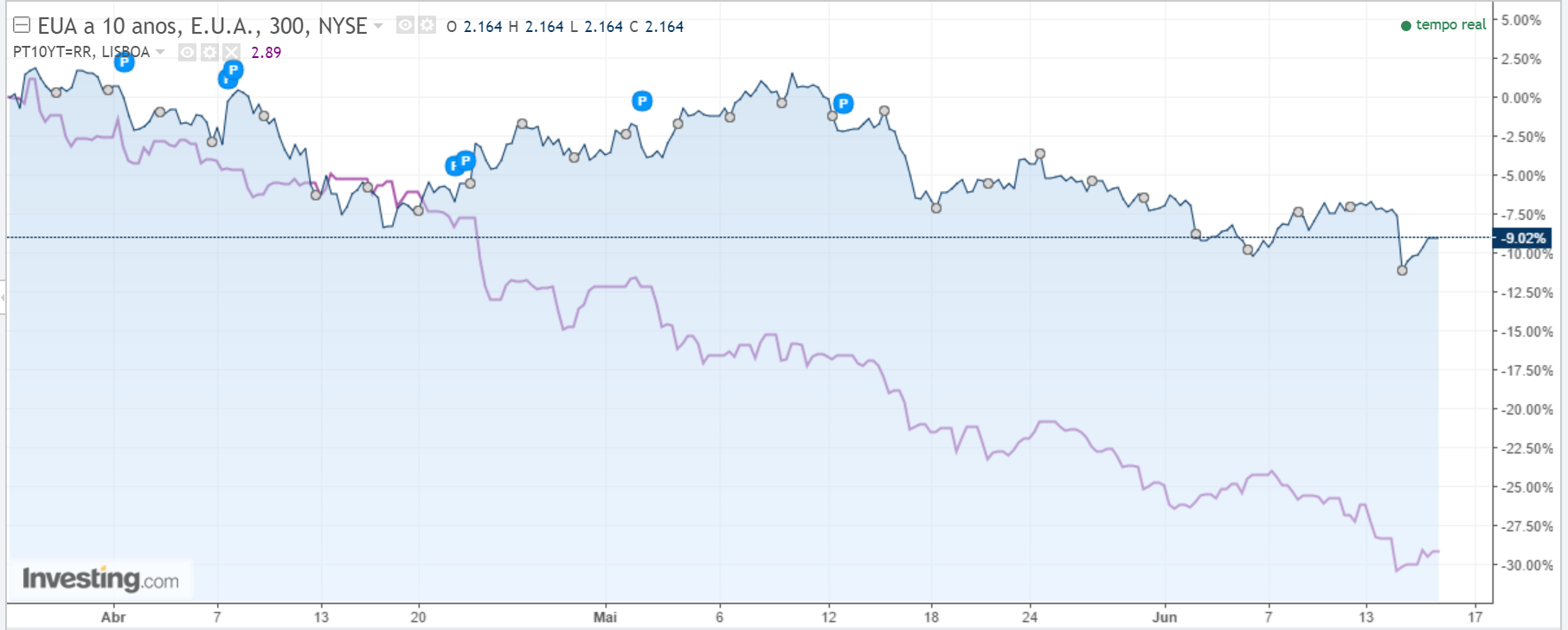 Yield 10Y de PT vs Yield 10Y USA últimos 3 meses ..... correlação da treta: