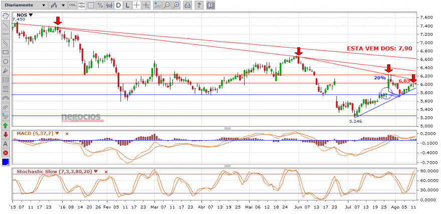Ulisses Pereira analisa as acções da Nos, considerando que a empresa pode estar quase a deixar de ser um dos patinhos feios da bolsa portuguesa. Para que isso aconteça a acção tem que quebrar a zona de resistência entre os 5,65 e os 5,80 euros.”