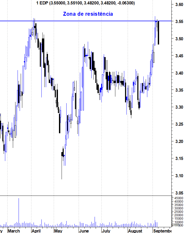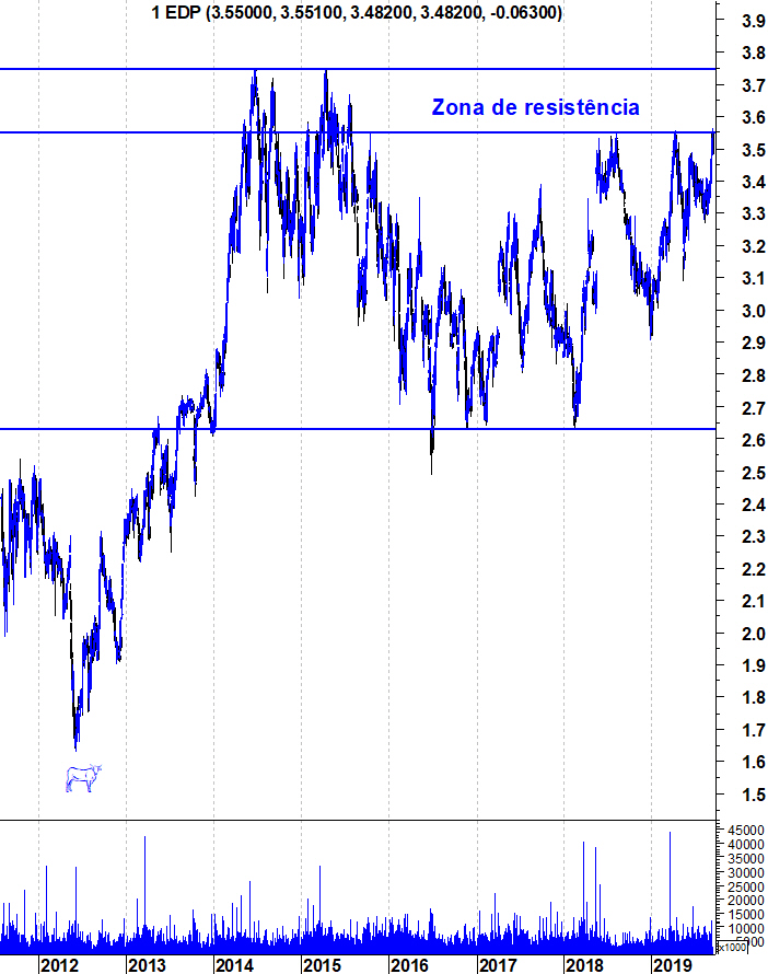 Com a subida da semana passada, a acção ficou encostada à sua primeira grande resistência, a zona dos 3,55 euros. Foi esta resistência que travou a subida da EDP em Julho do ano passado e em Abril deste ano, daí que seja normal que a acção tenha parado a sua subida agora nessa zona. Seria uma boa vitória para os touros ver a acção quebrar essa resistência. Caso isso aconteça, não demorará muito tempo até encontrar a derradeira resistência na zona dos 3,75 que é o máximo dos últimos 11 anos!