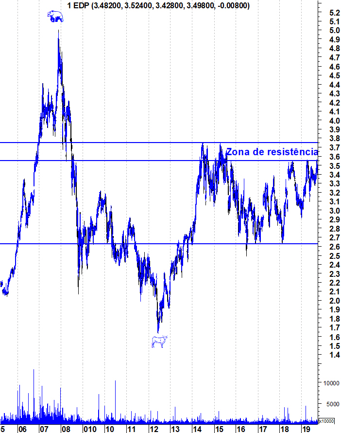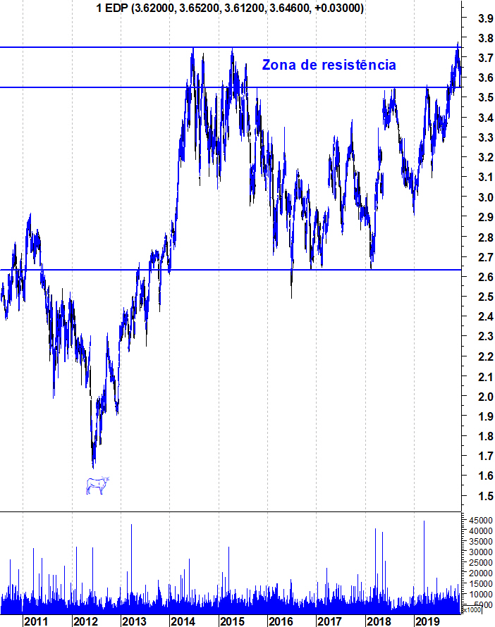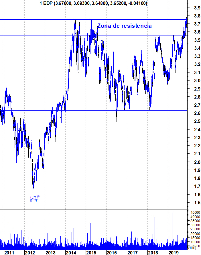 Não podemos, no entanto, dissociar o actual momento da EDP com os últimos anos em que a acção tem tido um comportamento muito tranquilo, quase indiferente aos bons e maus ventos que iam soprando na Bolsa portuguesa. Nos últimos 5 anos, o título tem lateralizado, frustrando as expectativas de ursos e touros. Mas, como a acção não quebrou qualquer suporte relevante nesse período, eu continuo a considerar que a acção se mantém num “Bull Market” desde 2012.