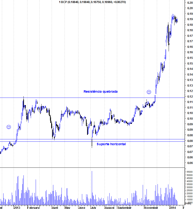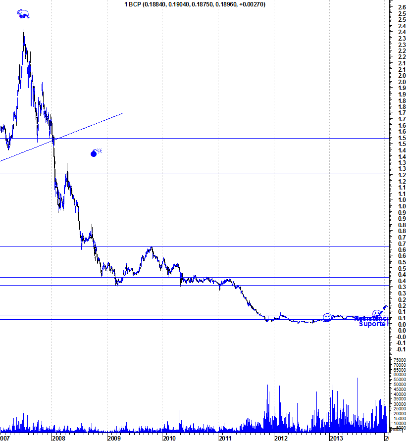 O BCP avaliado na Candle semanal observa-se uma ligeira resistencia a 0,21 seguida da zona dos 0,60. O suporte está nos 0,13.