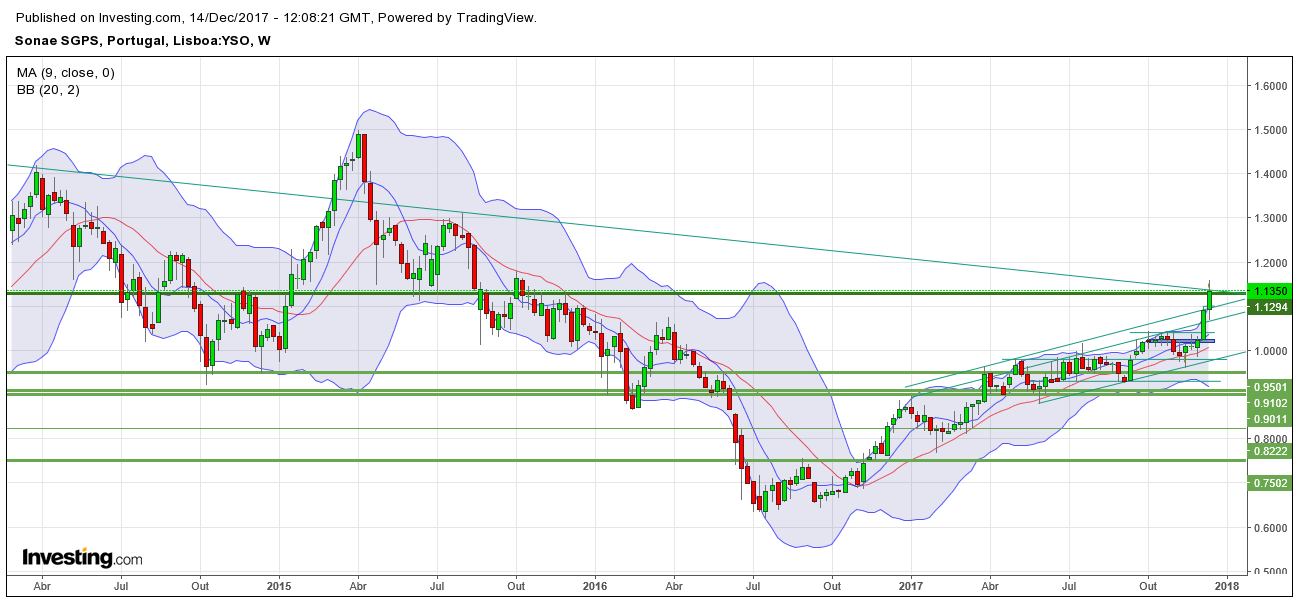 Confirmo que o RSI atingiu os máximos de Março e Outubro de 2017, mas destaco a tendência bullish de todos os restantes indicadores presentes no gráfico diário e uma OBV em máximos de 2017. É agradável de se ver a força que esta cotada representa atualmente, sendo que mesmo que venha aos 1,04€, para aliviar um pouco o RSI (também poderá fazer com consolidação por estes valores), poderei aproveitar a oportunidade para reforçar, pois a tendência é mais que visivel neste momento.
