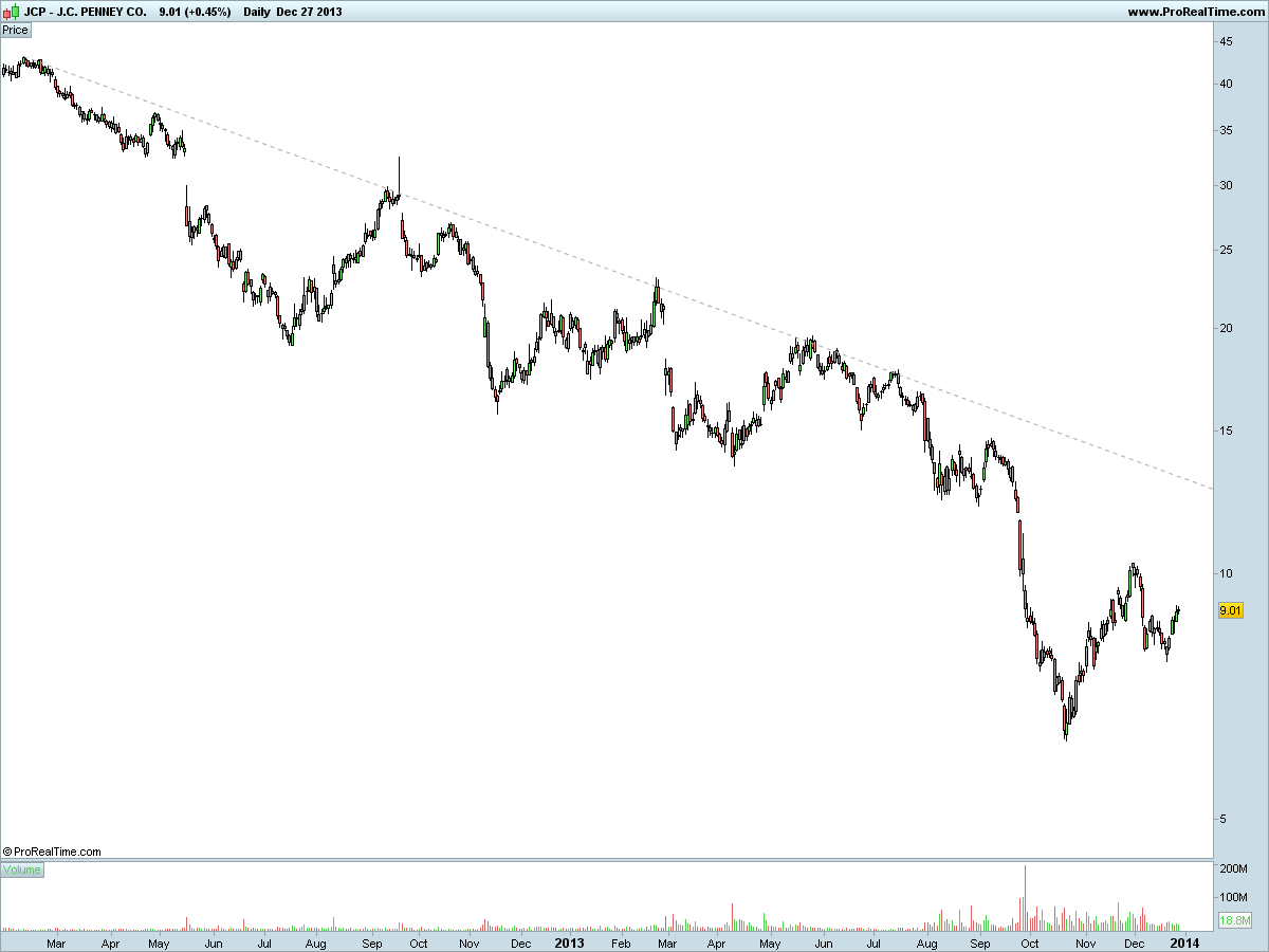 Sinceramente há várias coisas que saltam a vistta e todas elas sao importantes. Tens um suporte na zona dos 8 dolares, tens uma suporte que virou resistencia na zona dos 12,5 e tres toques na LTD. Por isso e que era importante que a JCP quebrasse a LTD em alta para poder ir aos 12,5.