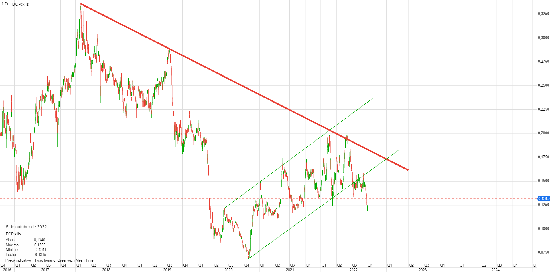 Sem mais, é isso mesmo. E um dia subirá como subirão todos os outros bancos e todas as outras bolsas como sempre acontece e voltará a acontecer. Basta olhar para o gráfico para ver que por alturas de março deste ano - há 6 meses - estava a cotar pelos mesmissímos valores por onde agora. Isso não impediu que em maio estivesse a cotar quase a 0,20.