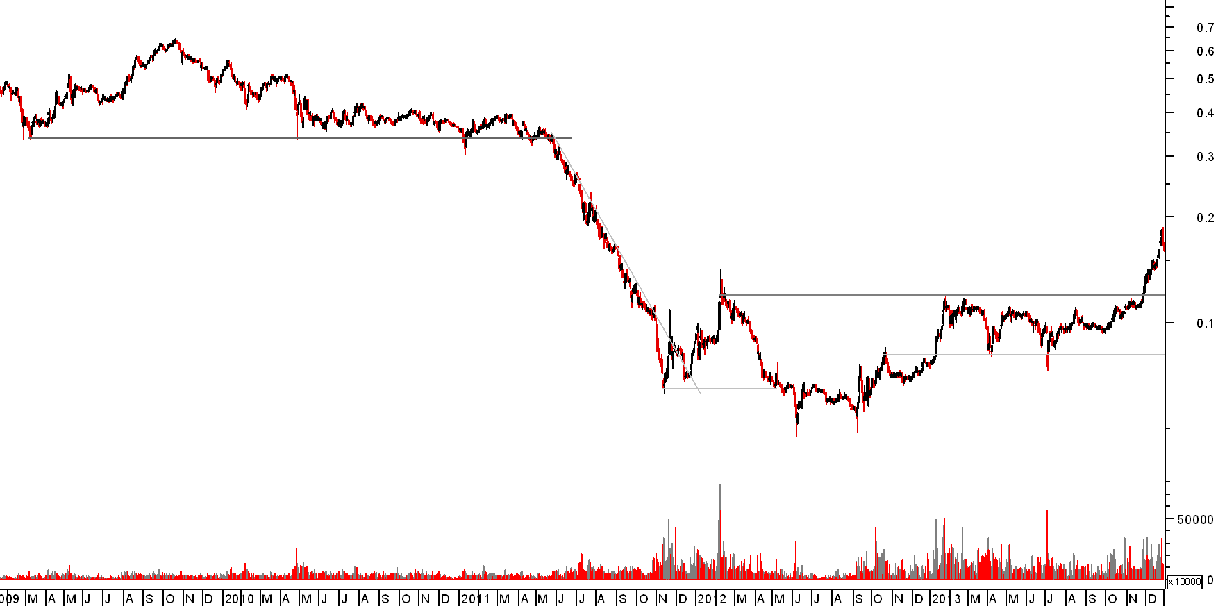 esbarrou pouco antes dos 0.19, que agora são o novo ponto de entrada (para mim!), onde ressaltou algum tempo - em 2011 - antes de continuar a queda e muitos, na qual me incluo, optaram por realizar mais-valias quando viram que a festa acabou.