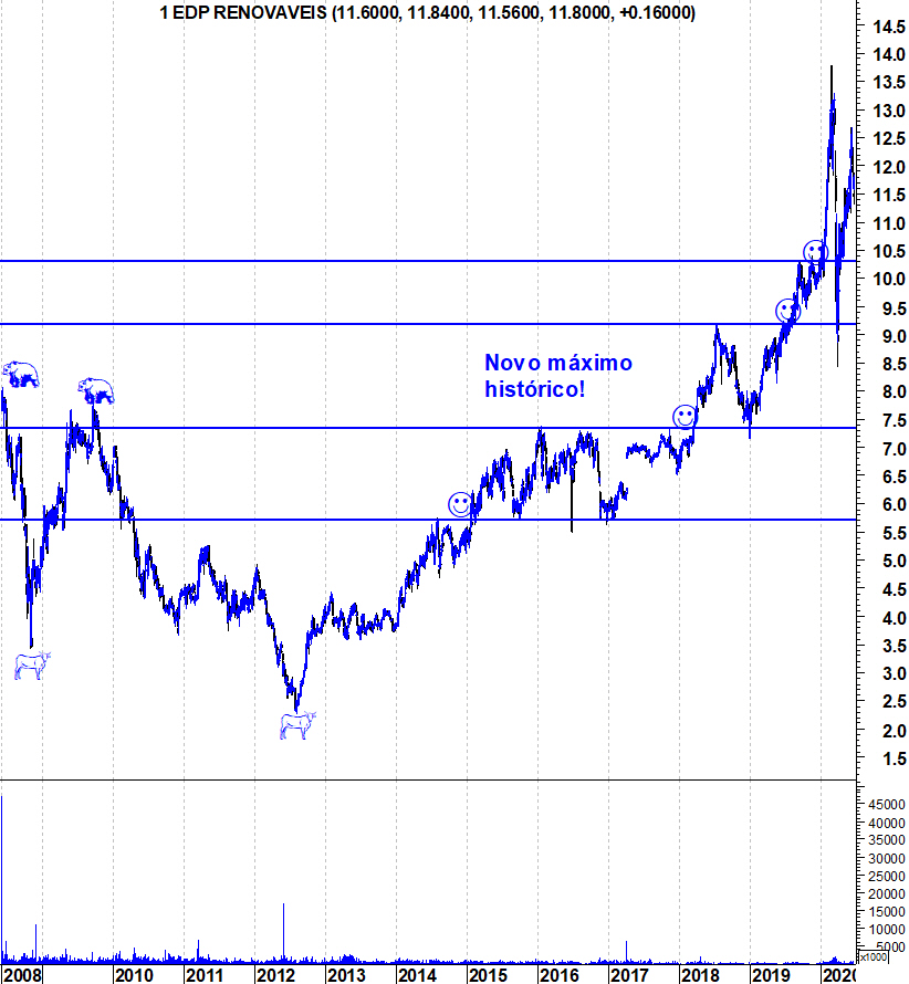 A EDP Renováveis é um caso de sucesso na Bolsa portuguesa e é o mais longo “Bull Market” em vigor entre as acções do PSI20. Mesmo a queda brutal e rápida provocada pela pandemia nos mercados foi praticamente recuperada, mostrando a força da acção que vive um “Bull Market” há 8 anos, algo raro na nossa Bolsa.
