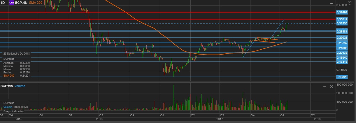 O BCP pode estar a chegar, em estado bastante sobrecomprado, aquela que considero a grande barreira do longo prazo, entre os 0.35 e os 0.40. Os 0.355 correspondem também ao target da minha bandeirola optimista.