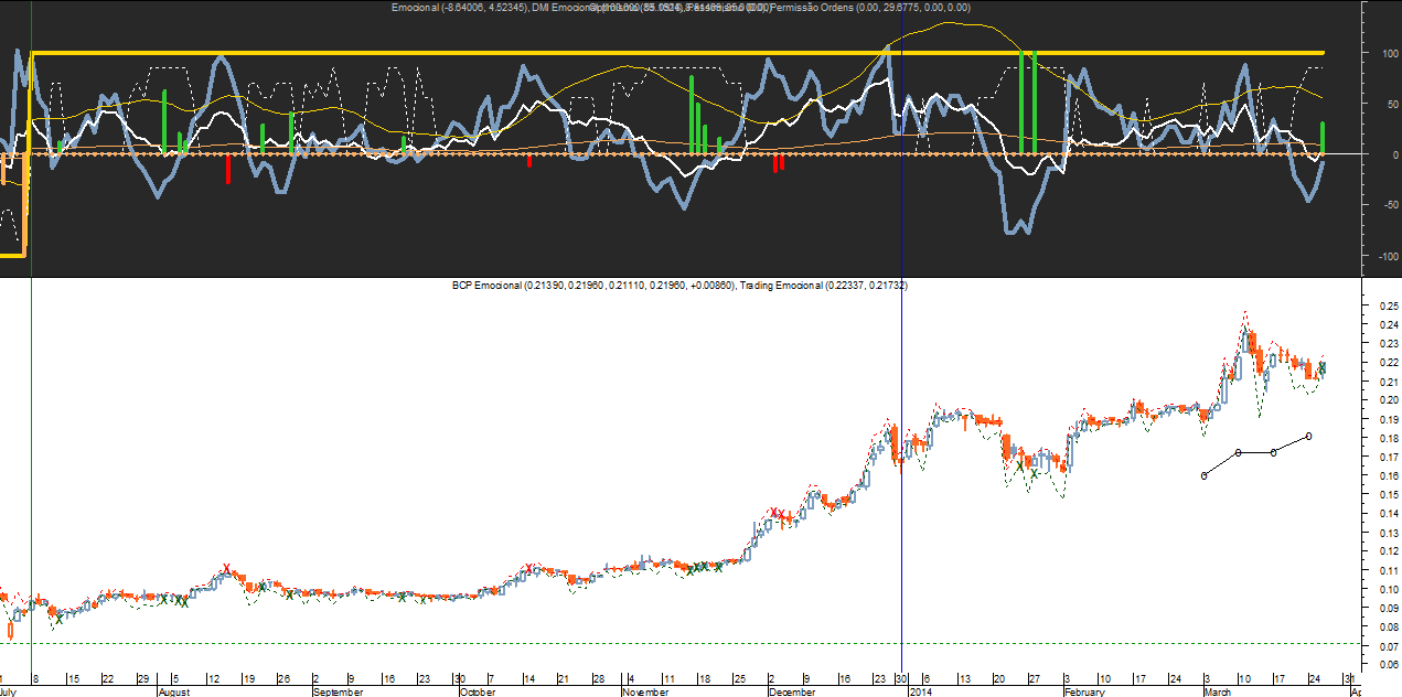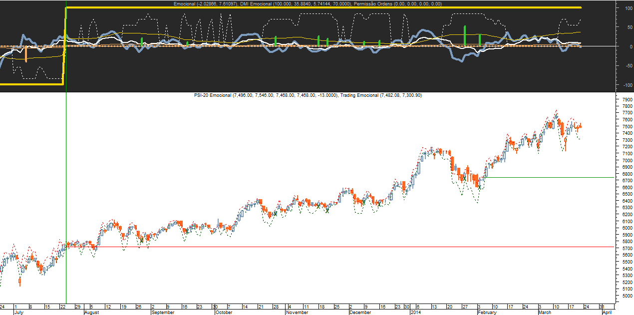 Finalmente, a propósito duma dúvida anterior que ficou pendente no PSI-20, sobre a que nível fecharia o “Emocional 2014” as suas posições compradas, passando de “bull” a neutral com sinal de vendas obtidas através do diagnóstico obtido no gráfico diário, o programa assinala o valor dos 6742 pontos, um nível muito próximo da correção em baixa que o PSI-20 registou há cerca de 1 mês e meio atrás em princípios de Fevereiro.